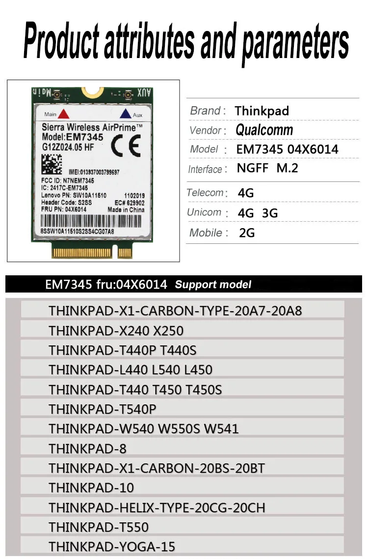 Características y especificacionesLa banda ancha móvil ThinkPad EM7345 4G LTE es una opción inalámbrica lista para WAN que proporciona acceso a Internet de alta velocidad sobre la marcha. WWAN es una solución de acceso remoto predecible y rentable. En lugar de administrar la configuración, el uso y el pago de múltiples soluciones de conectividad para sus trabajadores remotos (conectividad de oficina remota, Wi-Fi de hoteles y aeropuertos y acceso a la oficina en casa), puede usar un solo, solución rentable con amplia cobertura nacional, experiencia consistente, configuración simple, soporte integral y costo predecible.Características y beneficios del ThinkPad EM7345 4G LTE (4XC0F46957):Soporte LTE/HSPA +SIM abiertaCompatible con países de EMEA, Australia y Nueva ZelandaOfrece una verdadera experiencia de banda ancha a cualquier dispositivo, en cualquier momento y en cualquier lugar.Información técnica:Bandas compatibles UMTS(WCDMA)/HSPA +:Banda 1 (2100MHz)Banda 2 (1900MHz)Banda 4 (AWS 1700/2100 Mhz)Banda 5 (850MHz)Banda 8 (900MHz)Bandas compatibles con LTE:Banda 1 (2100MHz)Banda 2 (1900MHz)Banda 3 (1800MHz)Banda 4 (AWS 1700/2100 Mhz)Banda 5 (850MHz)Banda 7 U:2500 MHz - 2570 MHz D:2620 MHz - 2690 MHzBanda 8 U:880 MHz - 915 MHz D:925 MHz - 960 MHzBanda 13 (700MHz)Banda 17 (700Mhz)Band18 U:815 MHz - 830 MHz D:860 MHz - 875 MHzBand19 U:830 MHz - 845 MHz D:875 MHz - 890 MHzBanda 20 U:832 MHz - 862 MHz D:791 MHz - 821 MHzDatos GSM/GPRS/EDGE a 850 MHz, 900 MHz, 1800 MHz y 1900 MHzDatos GPS a 1575,42 MHz y 1227,6 MHzDatos GLONASS a 1602Mhz y 1246MHzEspecificaciones de rendimiento:Rango de voltaje compatible: 3.135 V a 3,6 VVoltaje de funcionamiento: 3,3 VRango de voltaje VBAT: 3.135V a 4,4 VPotencia de espera media (Radio RF apagada) 10mWSoporte de suspensión selectiva (conectado a la red) 4mWLa corriente máxima de transferencia de datos es de 2,5 AVelocidades DE DATOS HSPA + enlace descendente hasta 42 Mbps y enlace ascendente hasta 5,7 MbpsGPRS clase 33EDGE clase 33WCDMAEntorno operativo:La temperatura de funcionamiento total del módulo de acuerdo con la especificación 3GPP será de-10 °C a + 55 °C.Condiciones de funcionamiento extremas: + 55 °C A + 70 °CEntorno no operativo:Temperatura: -40 grados a 70 grados (B) (-40 grados a 158 grados (F)Humedad relativa: 5% a 95%