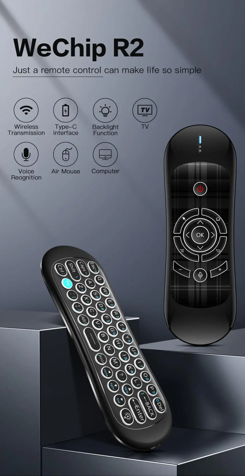 Comprar Wechip-teclado inalámbrico R2 para caja Android TV, Mouse con Control remoto, 2,4G, con retroiluminación y sensor de movimiento