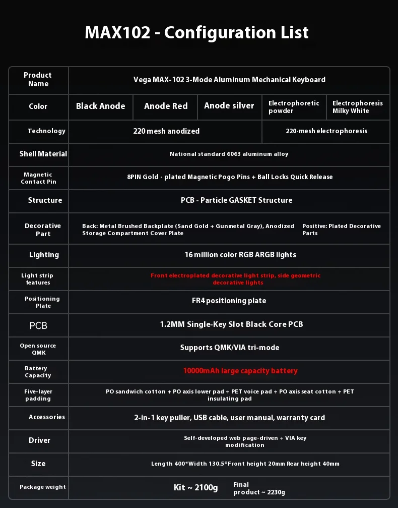Nombre del producto: VIKA MAX-102 el tercer teclado mecánico de bulto de aluminio para examen simulado Proceso: anodizado de malla 220/electroforesis de malla 220 Material de la carcasa: material de aluminio estándar nacional 6063 Pin táctil magnético: pin táctil magnético chapado en oro de 8 pines + cuenta táctil de liberación rápida Estructura: Estructura de GASKET de partículas de PCB Decoración: Parte trasera: Panel posterior de metal cepillado (oro arena + gris pistola), cubierta del compartimento de almacenamiento del ánodo/Frente: decoración galvanizada Iluminación: 16 millones de luces ARGB de colores Características de la tira de la lámpara: tira de lámpara decorativa galvanizada frontal, tira de lámpara decorativa geométrica lateral Tablero de posicionamiento: tablero de posicionamiento FR4 PCB: PCB de núcleo negro ranurado de una sola tecla de 1,2 mm QMK de código abierto: admite QMK/VIA el tercer examen simulado Capacidad de la batería: batería de alta capacidad de 10000 mAh Relleno de cinco capas: algodón sándwich PO + almohadilla del eje PO + almohadilla del ator de voz PET + algodón del asiento del eje PO + almohadilla aislante PET Accesorios: extractor de llaves 2 en 1, cable USB, manual de instrucciones, tarjeta de garantía Unidad: Largo 400 * Ancho 130.5 * Alto delantero 20 mm, Alto trasero 40 mm Peso del kit: Kit ≈ 2100g Producto terminado ≈ 2230g