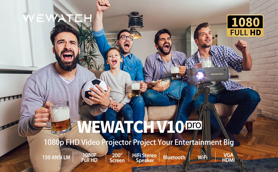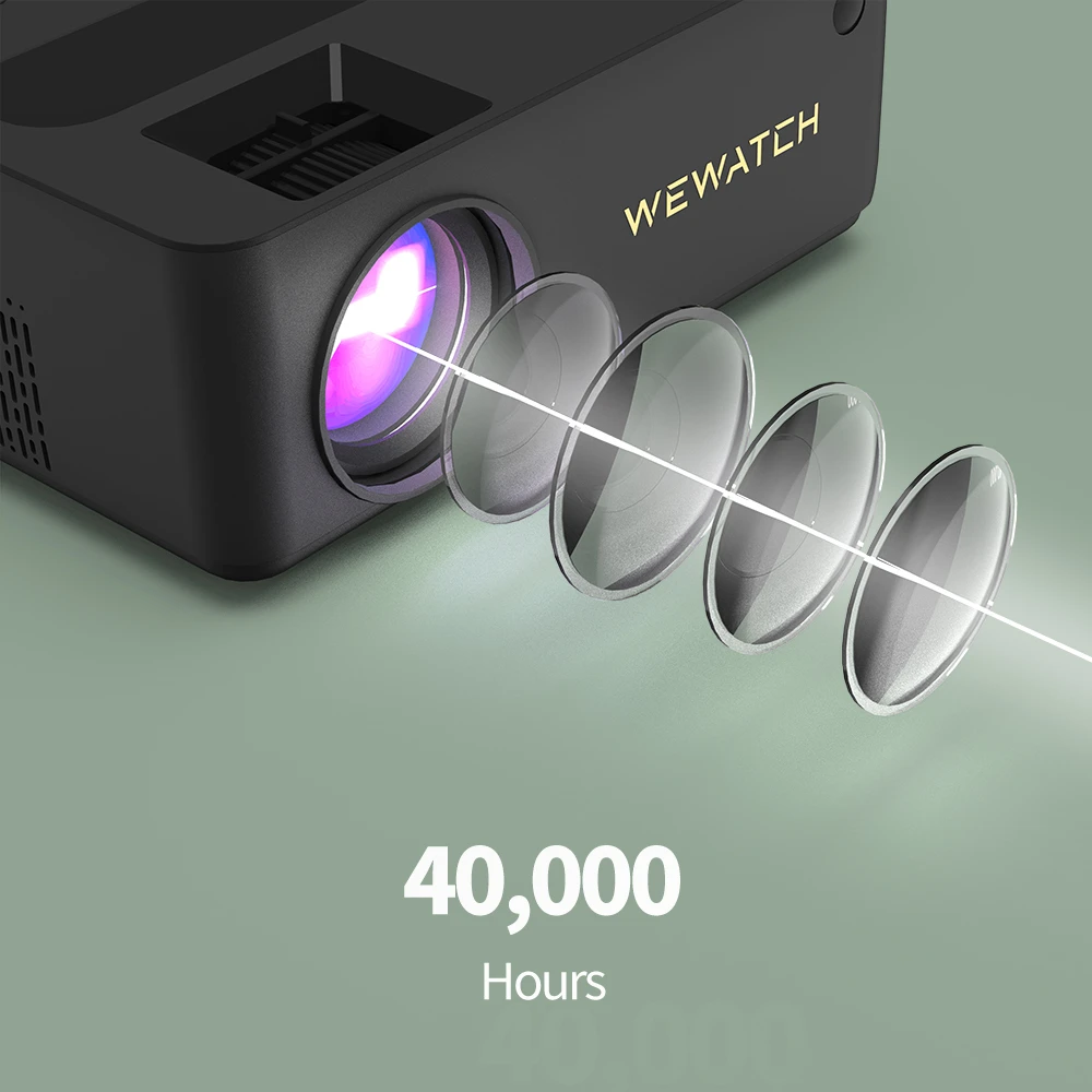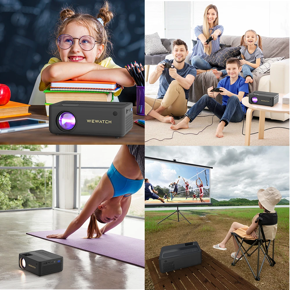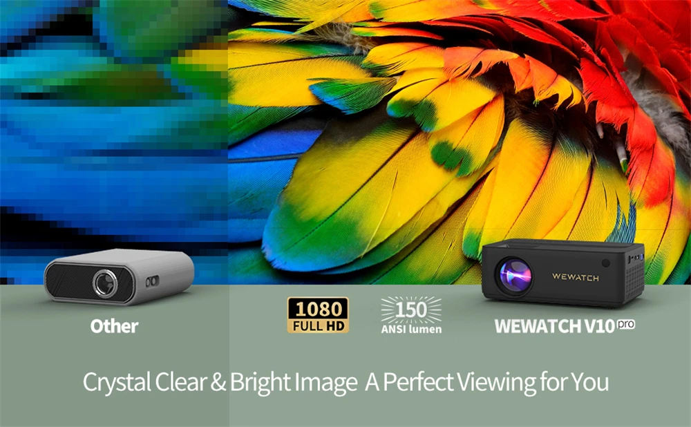 1080P Ultra-Sharp Image : The 2022 newly upgraded version, WEWATCH V10 Pro projector features a native 1920x1080 resolution, contrast ratio of 1000:1 and 50%+ brightness over previous models; now you can watch your movies, sports games and TV shows with your family and friends in true 1080p high-definition sharpness and fine details.