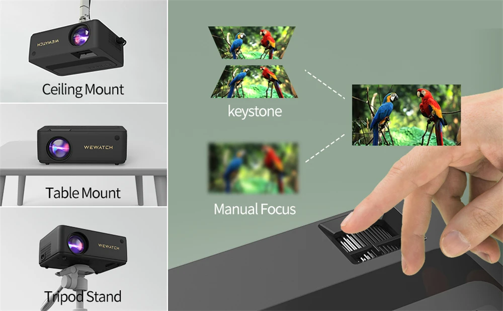 Sleek Appearance & Portable Design : The WEWATCH V10 Pro comes in a contemporary black accent, allowing it to blend in your home decoration style nicely and easily; it is also easy to take out with you for an outdoor movie night thanks to the small footprint of 214x160x81.7mm and light weight of 1.1 kg.