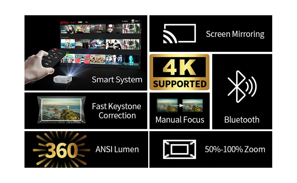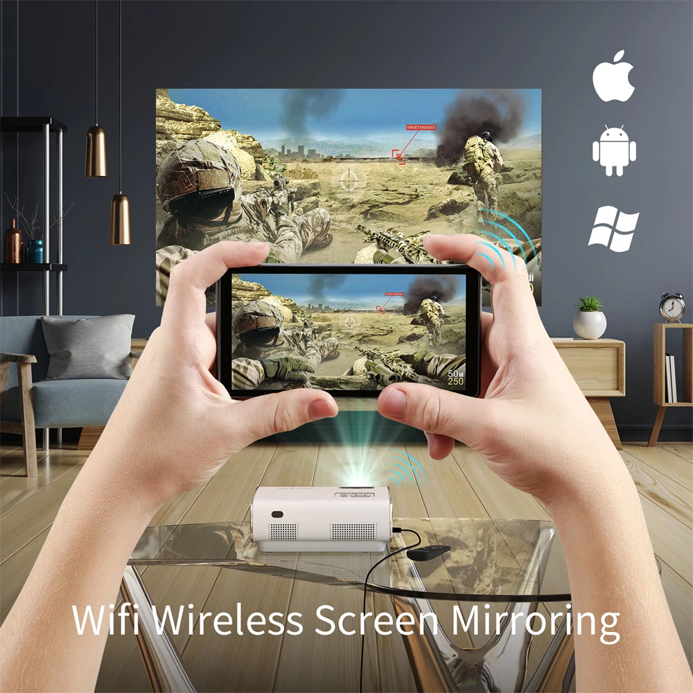 <WiFi y Bluetooth>: Gracias a la función WiFi, puede reproducir de forma inalámbrica sus videos, aplicaciones y fotos desde dispositivos iOS y Android a la gran pantalla del proyector para un mayor disfrute; Para una experiencia de película mejorada, puede emparejar el proyector a su barra de sonido favorita a través de Bluetooth.