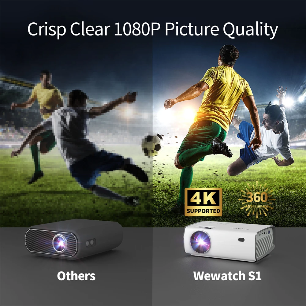 <Impresionante resolución de 1080p>: El proyector de vídeo WEWATCH S1 proporciona imágenes impresionantes y detalladas en 1920x1080 píxeles y 360 lúmenes ANSI; Películas, programas de TV, imágenes o lo que quiera ver es nítido y claro; ve películas o juega con una experiencia inmersiva.