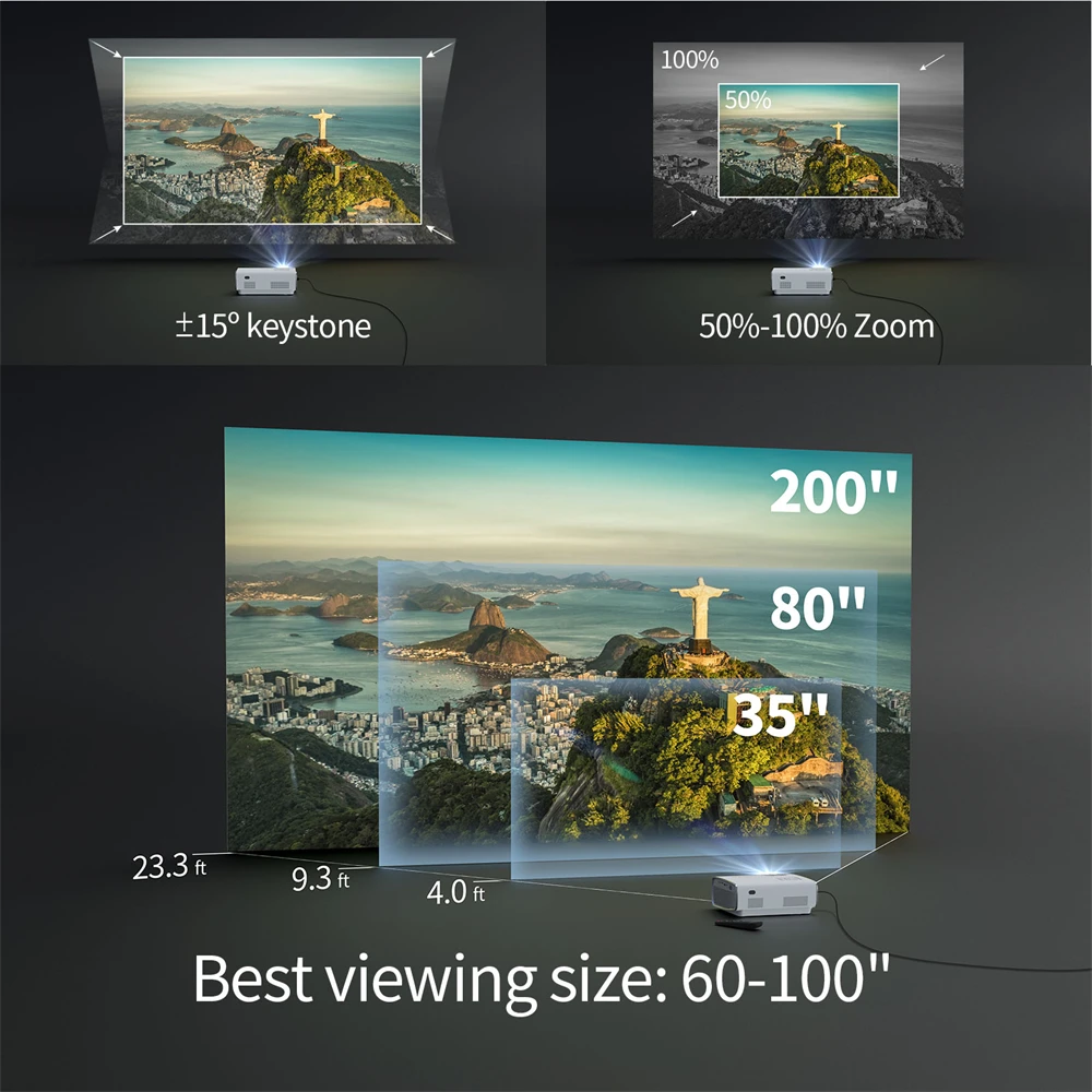 <200 "Pantalla grande entretenimiento>: Disfrute de una proyección de pantalla gigante de hasta 200 "de 23 pies; La conveniente corrección vertical y horizontal de la piedra angular le permite ajustar la imagen a la perfección; La proyección delantera y trasera es compatible.