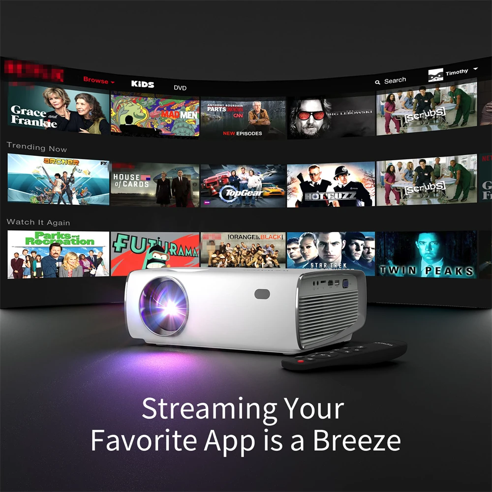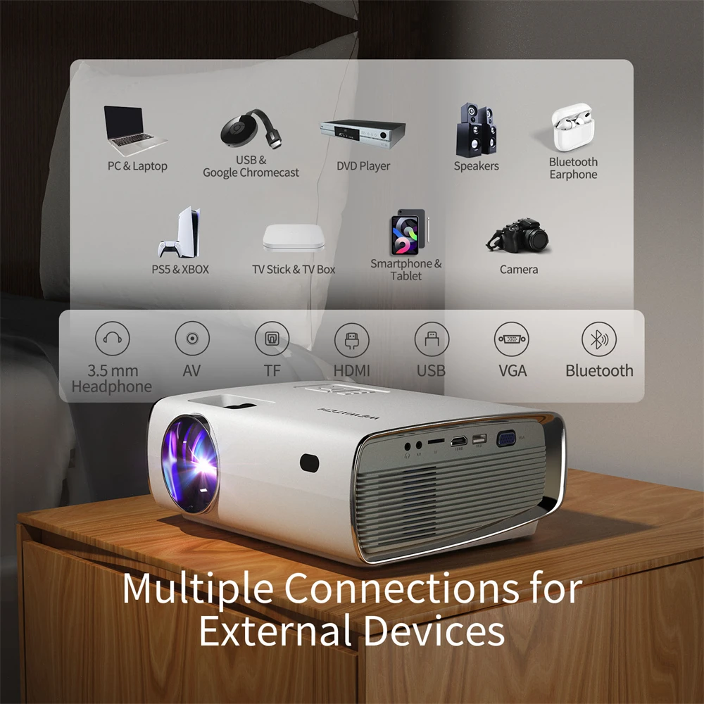 <WiFi y Bluetooth>: Gracias a la función WiFi, puede reproducir de forma inalámbrica sus videos, aplicaciones y fotos desde dispositivos iOS y Android a la gran pantalla del proyector para un mayor disfrute; Para una experiencia de película mejorada, puede emparejar el proyector a su barra de sonido favorita a través de Bluetooth.