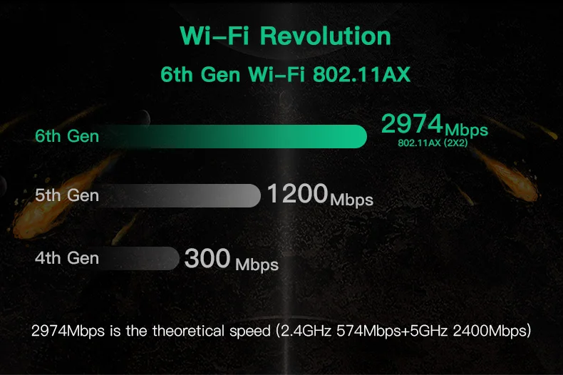 Velocidad de 2,4 Gbps en la banda de 5 GHz (160 MHz) y alrededor de 574 MB/s usando la banda de 2,4 GHz (802.11ax en ambos).