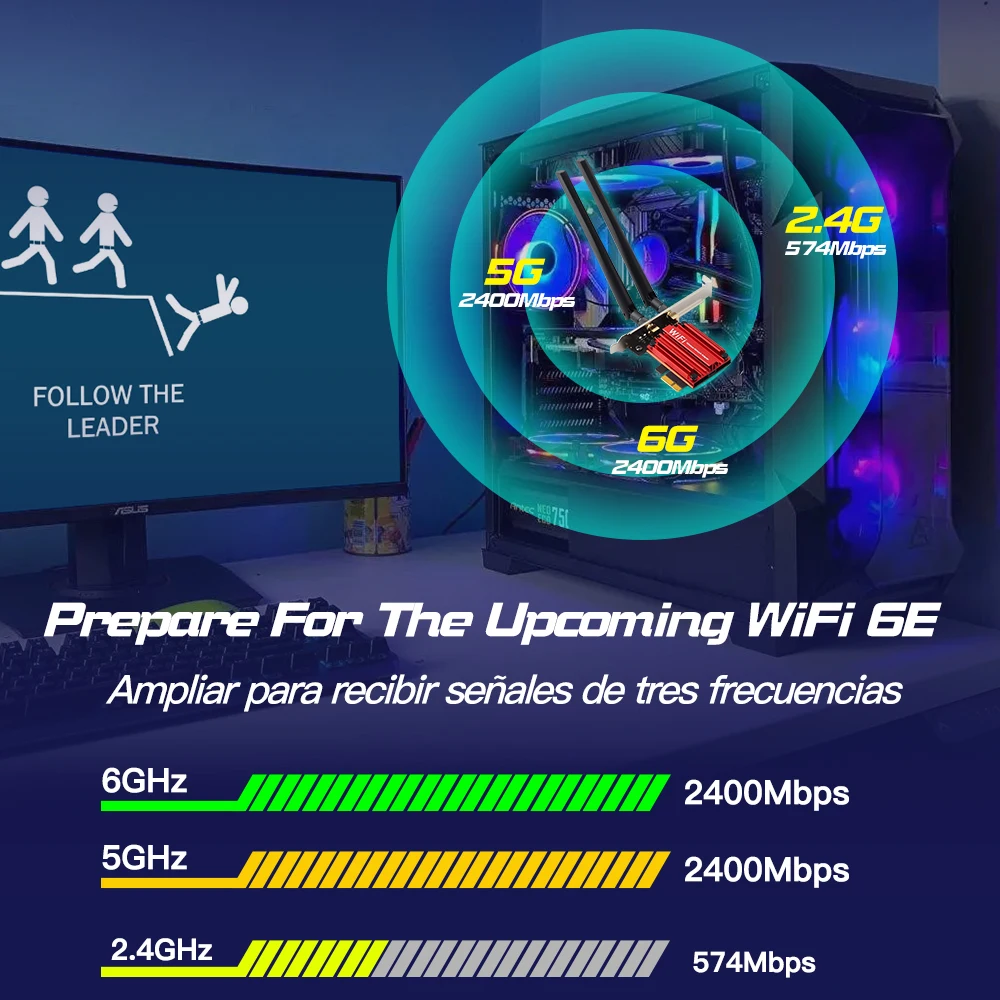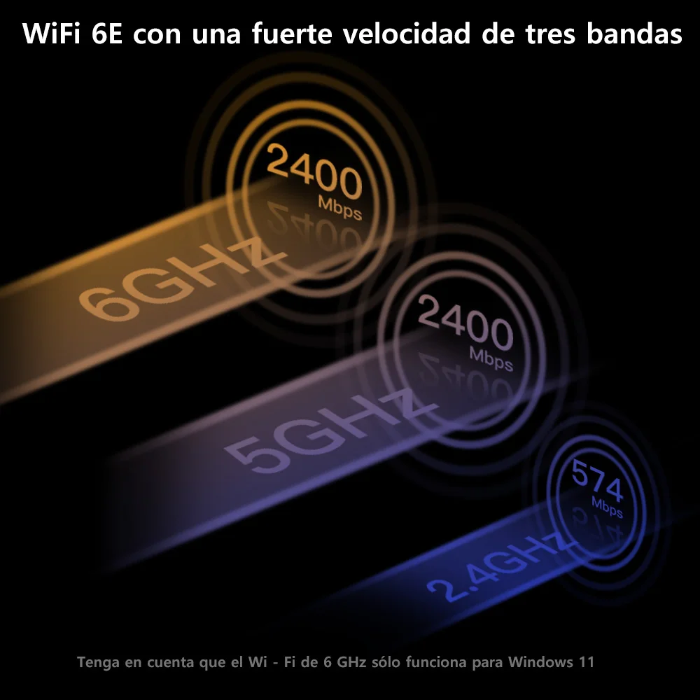 Tarjeta PCIe WiFi 6E-alcanza velocidades increíbles de hasta 2,4 Gbps (2402 Mbps en 6GHz, 2402 Mbps en 5 GHz o 574 Mbps en 2,4 GHz) con latencia ultrabaja y conectividad ininterrumpida usando tecnologías Wi-Fi 6E (necesita trabajar con wifi6e 160Mhz)