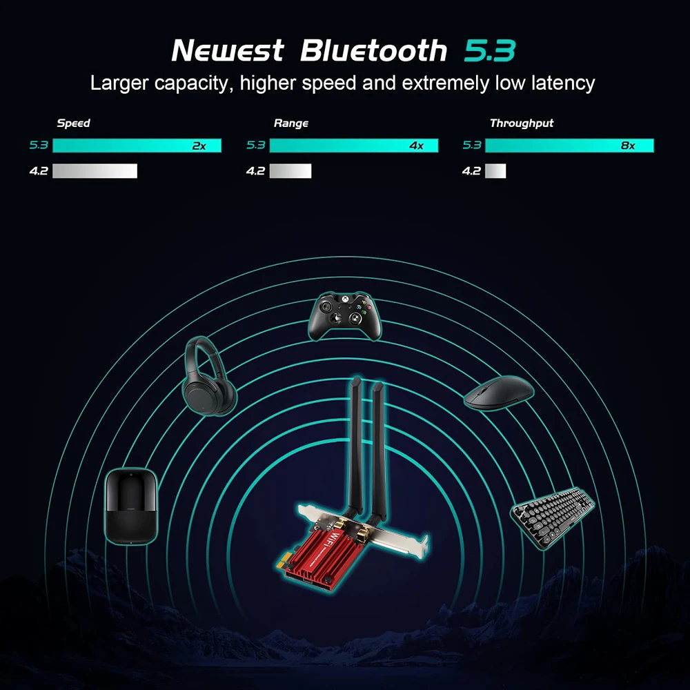 Bluetooth 5,3 para una mayor velocidad y alcance-equipado con la última tecnología Bluetooth, este adaptador PCIe logra velocidades 2x más rápidas y una cobertura 4x más amplia en comparación con Bluetooth 4,2 para que pueda conectar sus dispositivos favoritos como controladores de juego, auriculares y teclados para la configuración definitiva.
