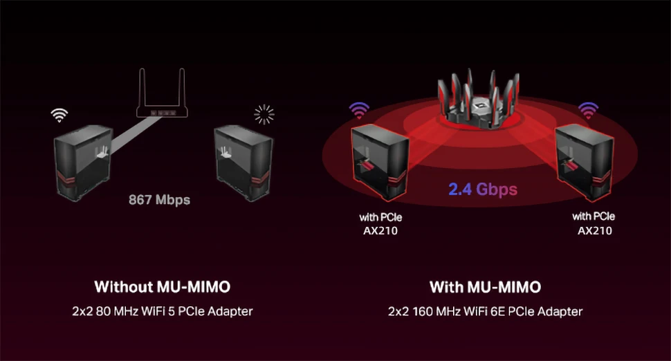 La tarjeta WiFi Intel AX210 lleva la recepción WiFi de su PC al siguiente nivel con la combinación de OFDMA y MU-MIMO. Esto garantiza la eficiencia de la conexión WiFi de su PC de escritorio al permitir que más dispositivos se comuniquen con su router simultáneamente en lugar de esperar datos a su vez.