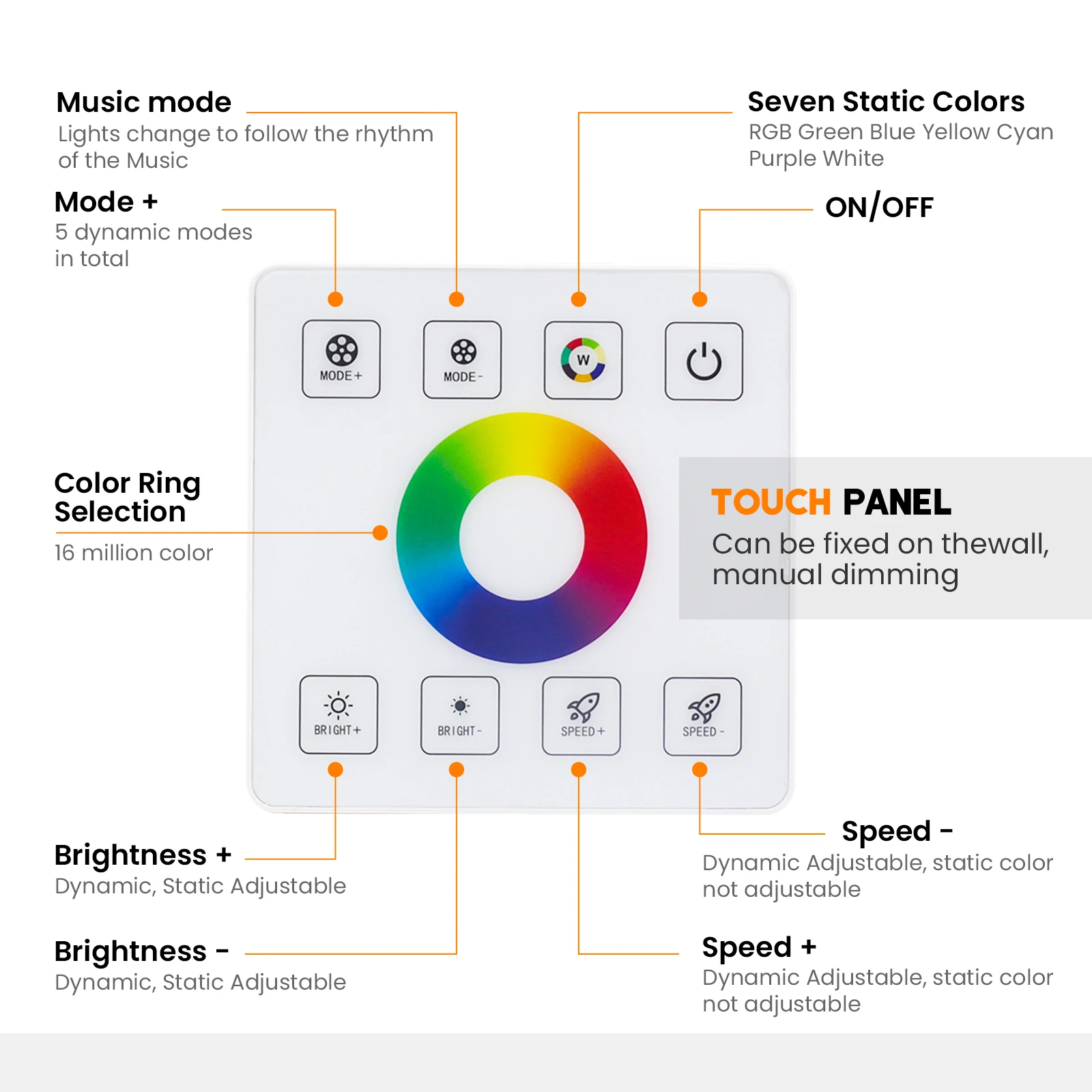 Este es el controlador táctil WIFI + Bluetooth RF de modo dual, distancia de control remoto: 10-30 metros.Amazon Alexa y parlantes de voz inteligentes como Google Assistant, Xiaodu y Tmall Ghost realizan el control por voz de la luz.El panel táctil se puede fijar con cinta adhesiva de doble cara o tornillos para una fácil instalación y no viene con batería, y se requiere una pila de botón CR2025 (no incluida).El control remoto táctil no tiene batería y es necesario instalar pilas AAA.1 controlador puede controlar un máximo de 20 metros de barras de luz RGB de doble fila.