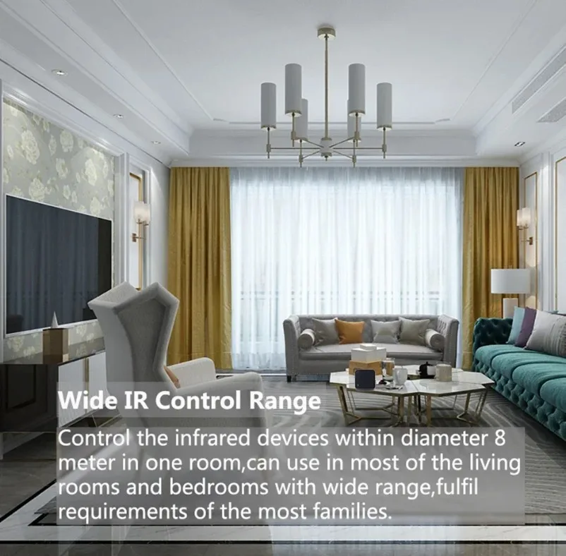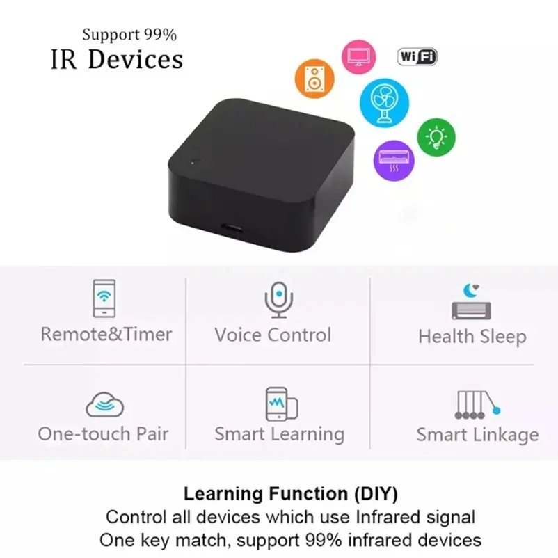 Parámetro del producto: * Entrada: DC 5V/1A (Micro USB SIN adaptador) * Frecuencia infrarroja: 38 KHz * Distancia del control remoto IR: 8 m * Conexión: Wi-Fi 2,4 GHz * Aplicación: TuyaSmart o Smart Life * Material: ABS * Tamaño: 50*50*19mm