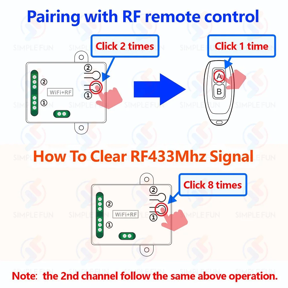 4El icono del módulo "WiFi+RF" aparecerá en la interfaz de la APLICACIÓN y luego funcionará de acuerdo con las indicaciones en la interfaz de la APLICACIÓN.(Si no, haga clic en "+", busque el icono "cambiar (WiFi)" en la categoría "eléctrica".●Emparejamiento con control remoto RFNota: el segundo canal sigue la misma operación anterior.●Cómo eliminar la señal de RF:Presione el botón de emparejamiento "1"8 veces