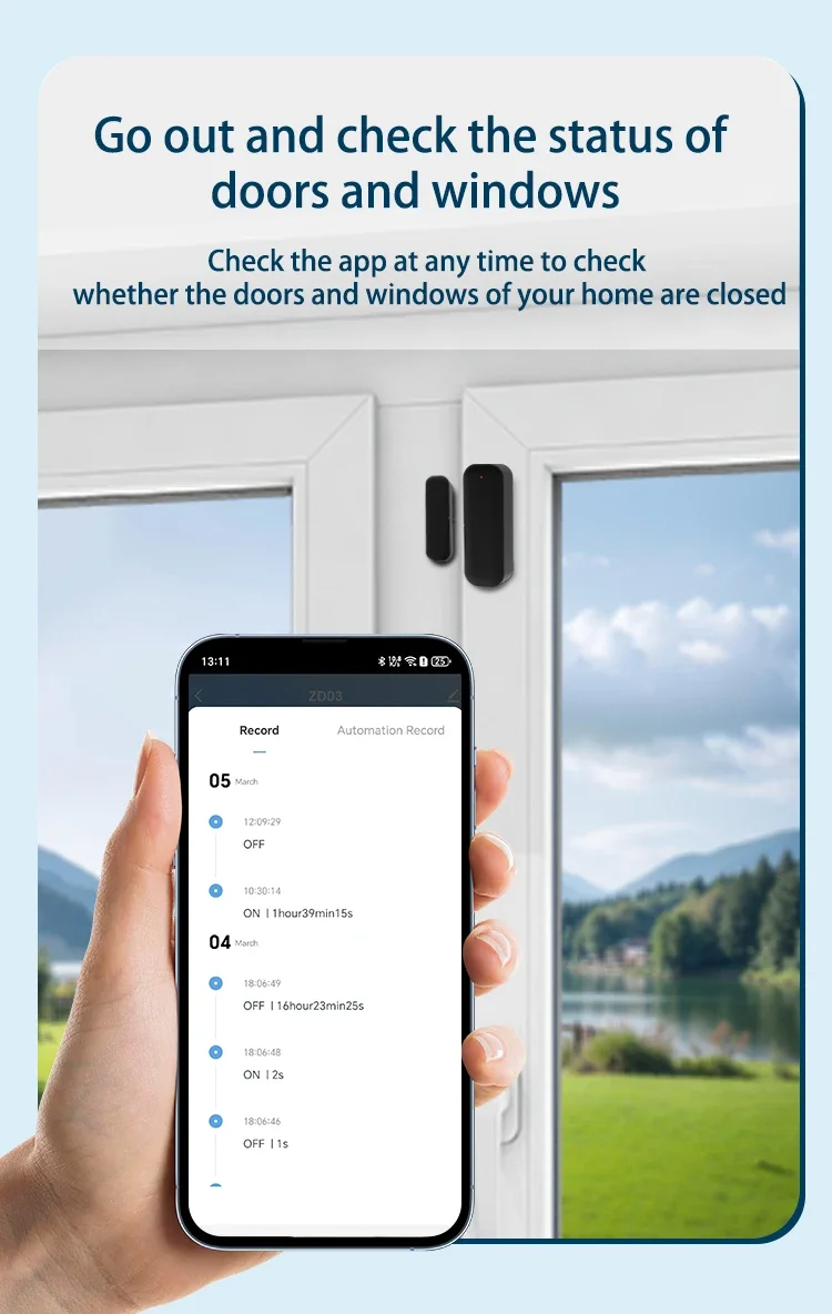 Envíe una notificación instantánea a su teléfono inmediatamente cuando se abra o cierre una puerta o ventana.Mantenerte informado todo el tiempo.