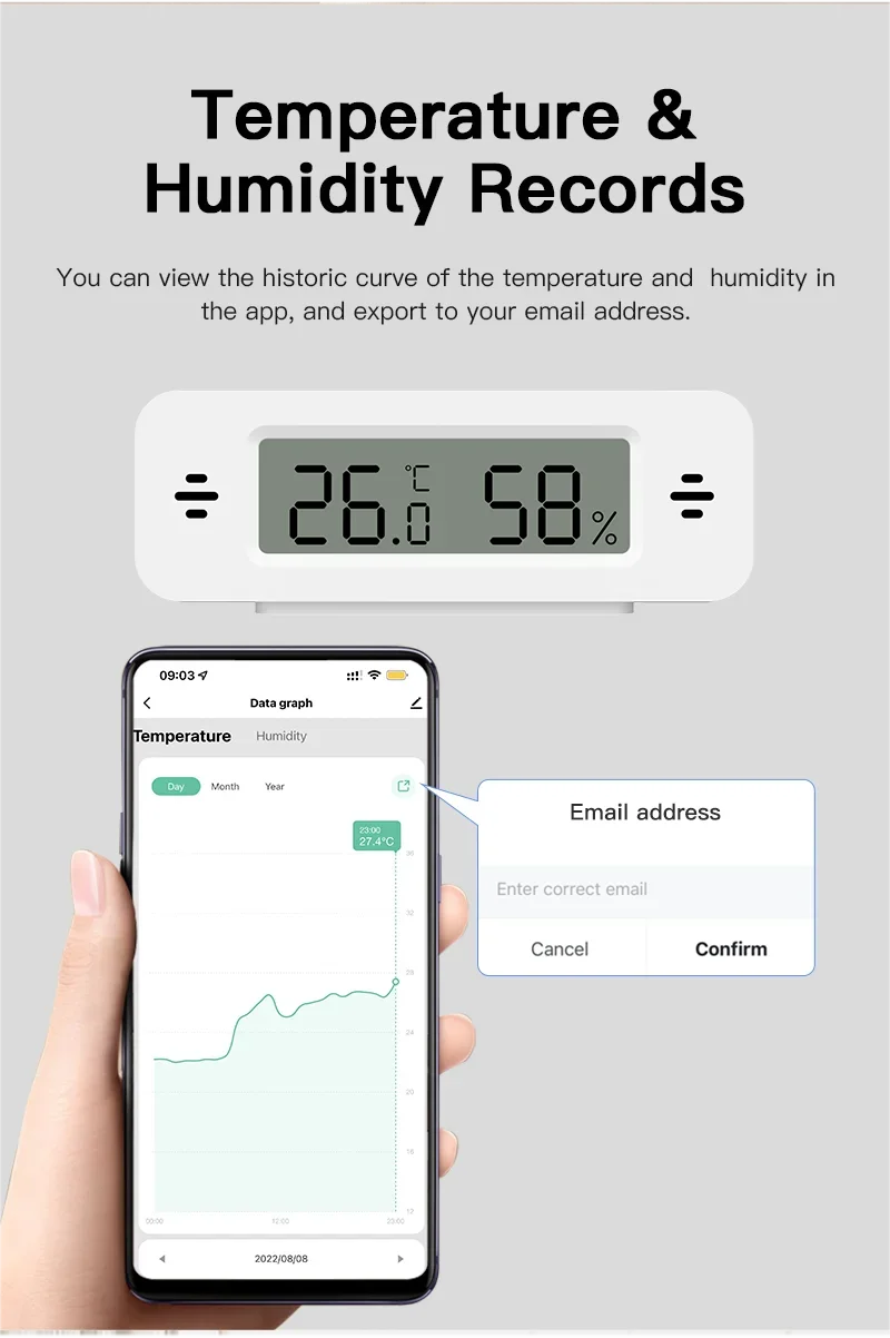 Puede ver la curva histórica de temperatura y humedad en la aplicación y exportarla a su dirección de correo electrónico.