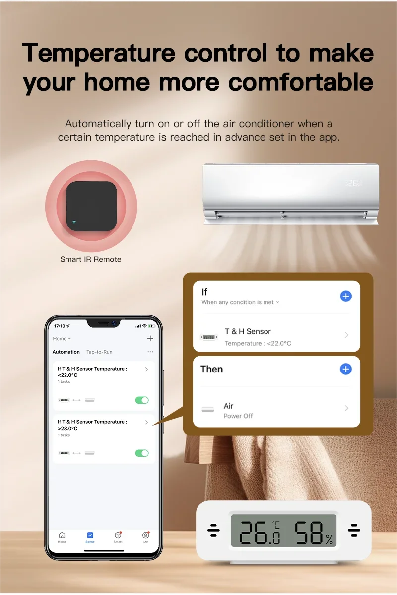 El sensor se puede utilizar como fuente de datos de temperatura y humedad de Tuya Smart, Smart Life, Amazon Alexa, Google Home.Puede realizar muchos procesos automatizados basados en la fuente de datos.