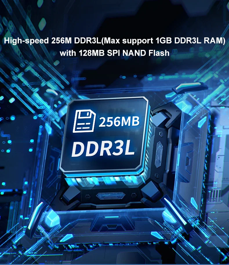 ● DDR3L de 256 MB de alta velocidad con almacenamiento flash SPI de 128 MB,Máximo 1 GB de RAM DDR3L