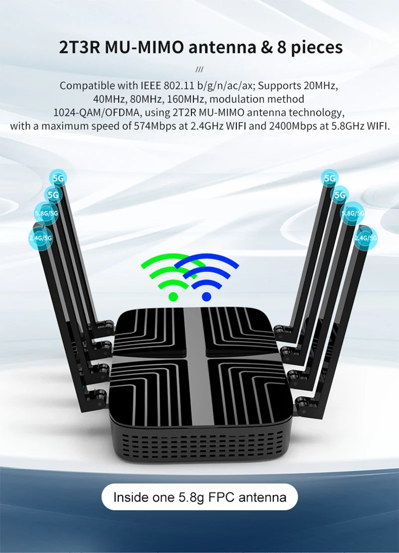 ● Cada canal WiFi está equipado de forma independiente con FEM de alta potencia, que se combina con una antena de alta ganancia para lograr una cobertura súper WiFi.