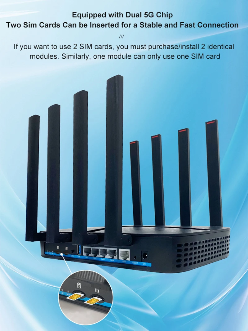 4 Admite la función 4G/5G (es necesario instalar el módulo 4G/5G dentro del enrutador)5 Interfaces 2*M.2 integradas, función de comunicación 5G ampliable, compatible con buses USB 3.0 y USB 2.0