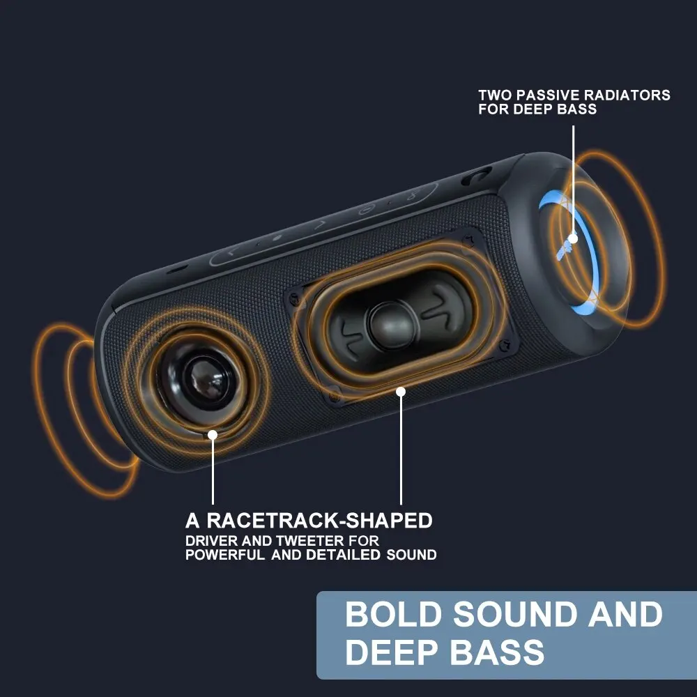 Portable bluetooth speaker with 2 way speaker system, brings you loud, crystal clear and powerful sound: The dual way speaker design provides excellent low and mid range sound, while the independent tweeter produces crisp and clear high frequencies. P3 also features high-quality low-frequency radiators at both ends, which can effectively enhance bass and deliver deep bass.