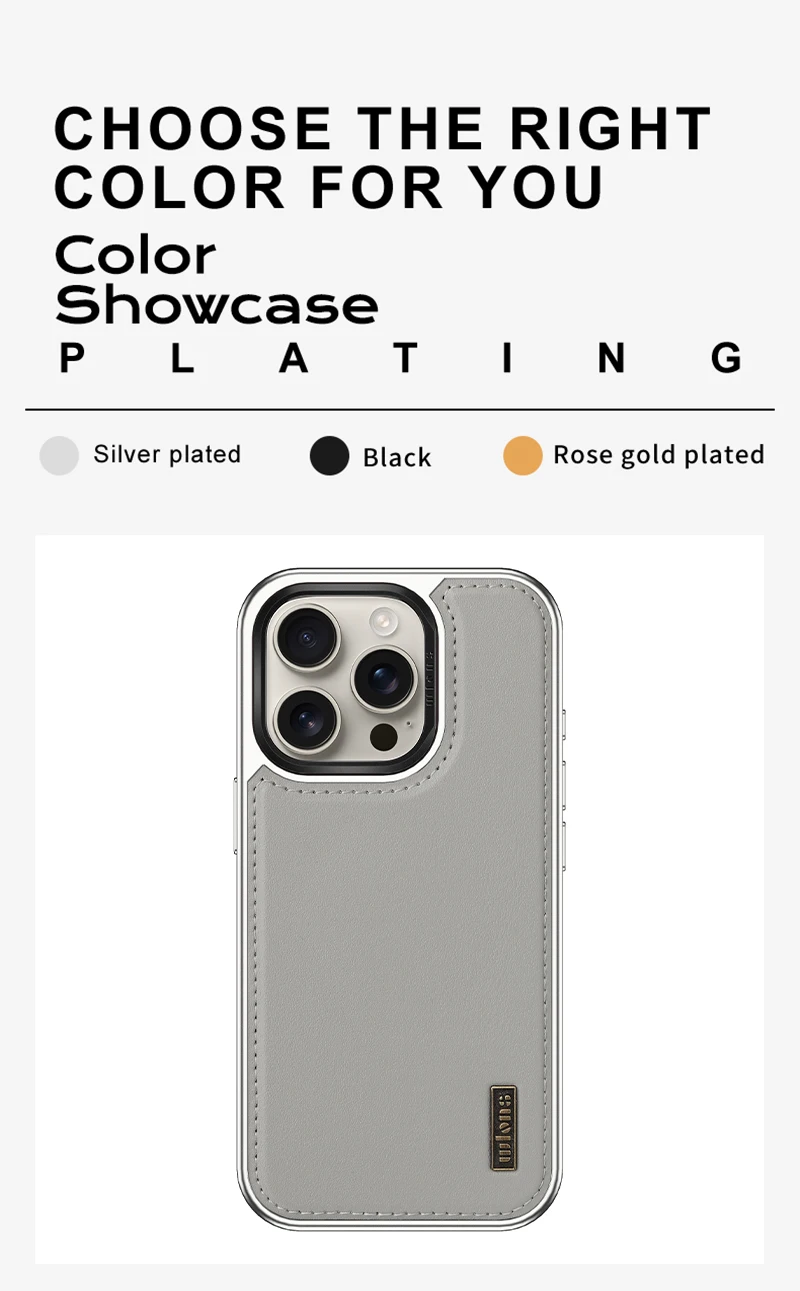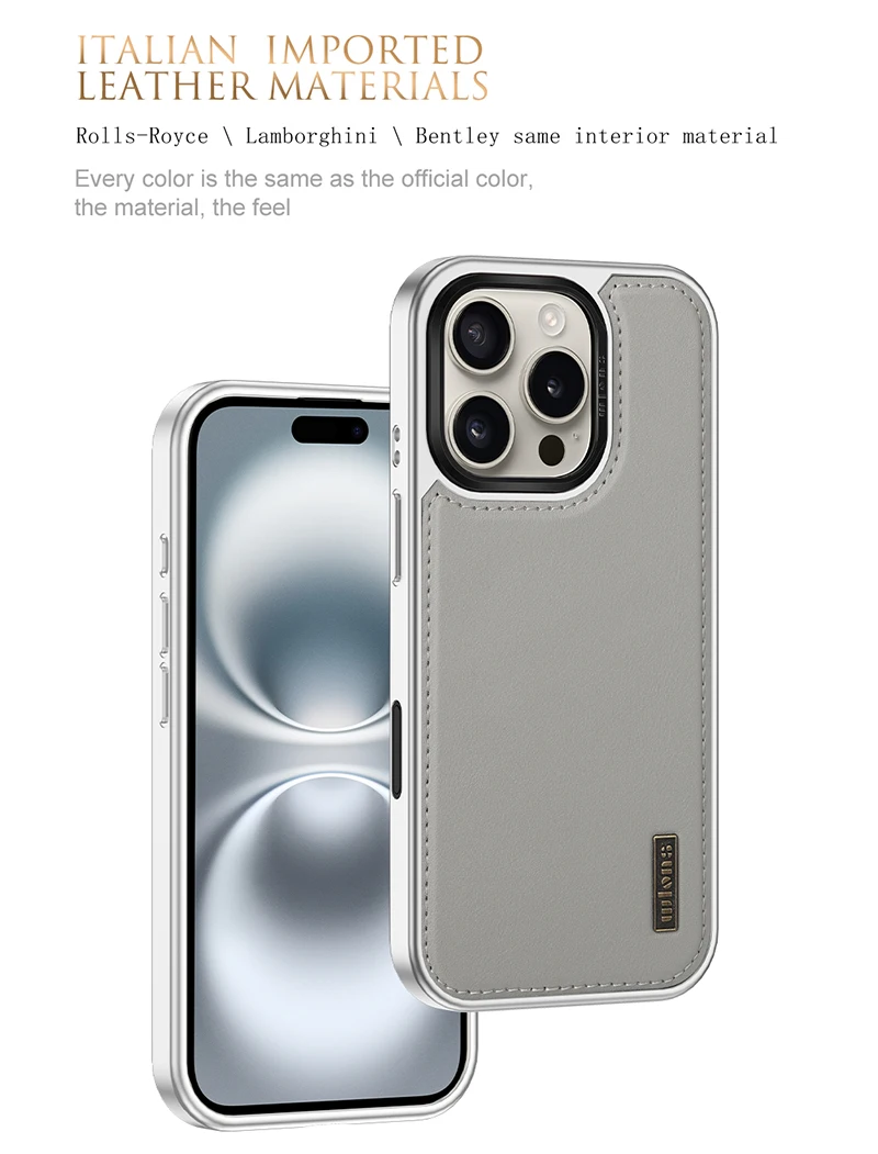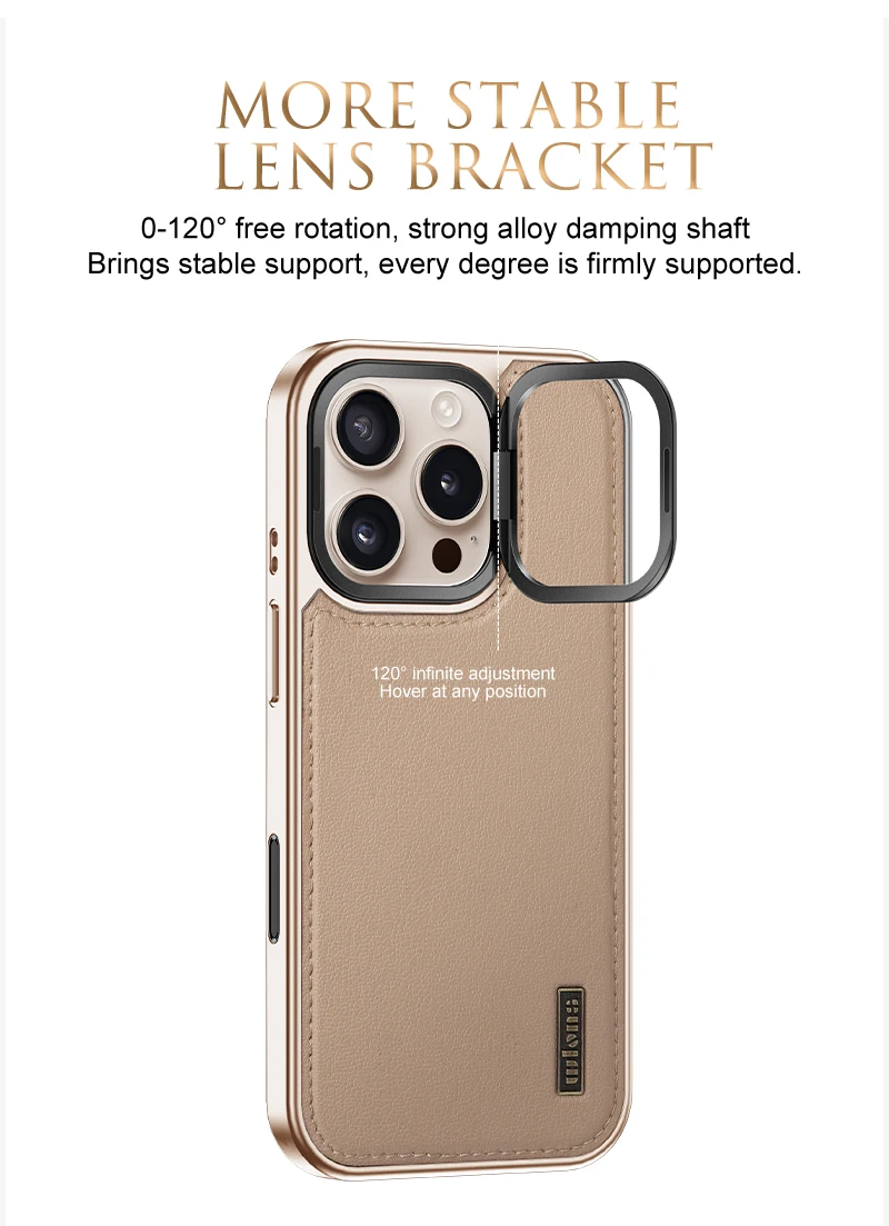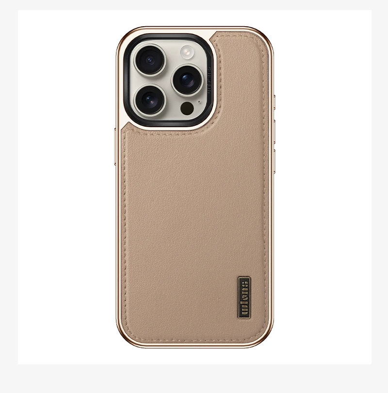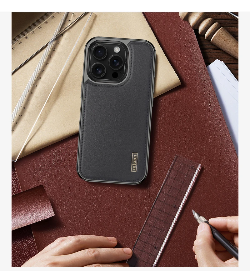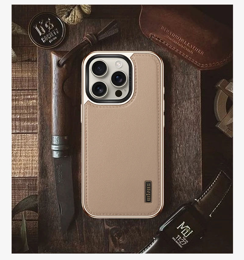 Wlons Defense Series Funda de cuero genuino chapada a prueba de golpes para iPhone 16 15 Pro Max lente soporte de Metal contraportada