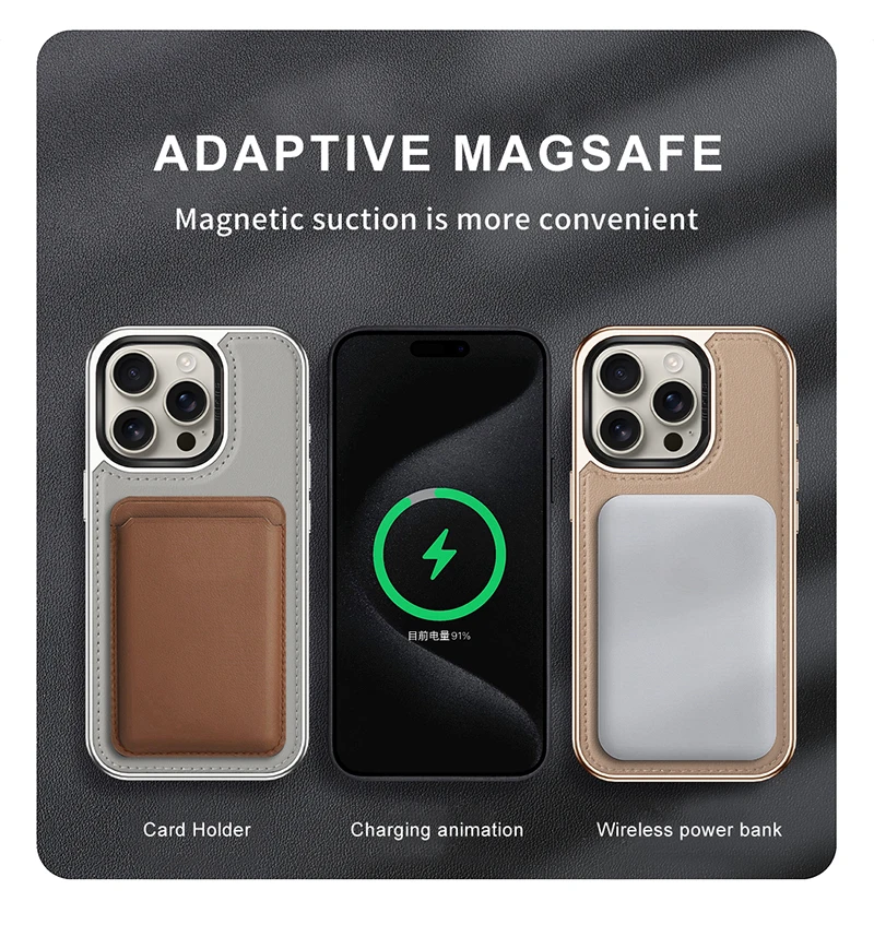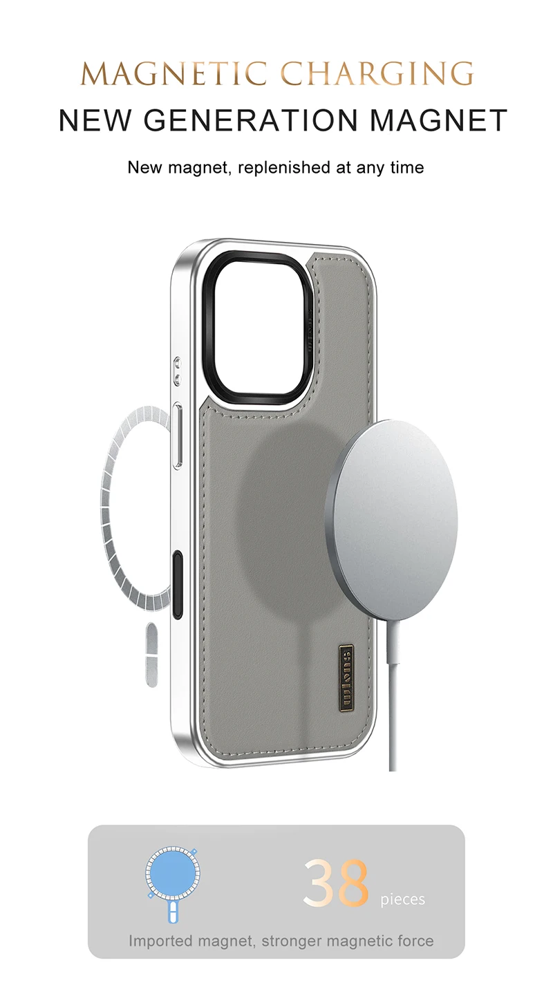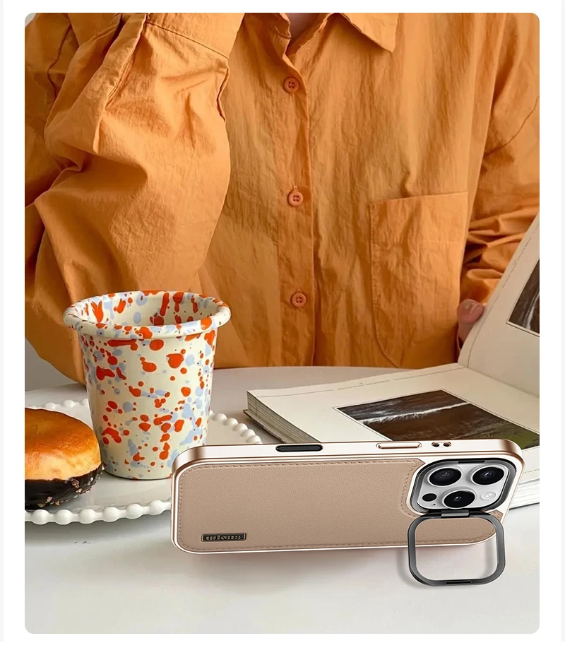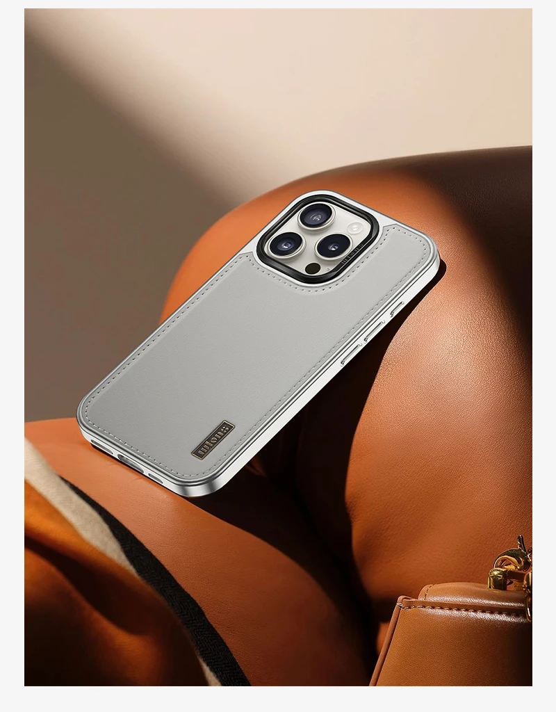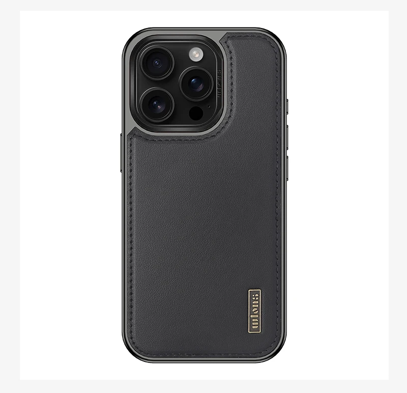 Wlons Defense Series Funda de cuero genuino chapada a prueba de golpes para iPhone 16 15 Pro Max lente soporte de Metal contraportada