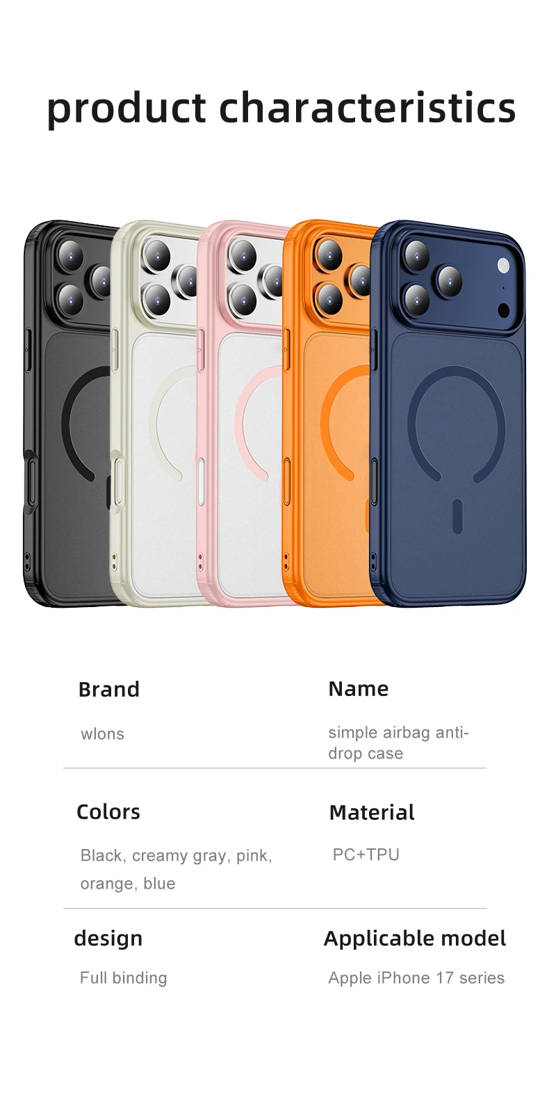 Wlons Magsafe-funda magnética de carga inalámbrica esmerilada a prueba de golpes para iPhone 17 Pro Max 17, funda de armadura resistente con sensación de piel de aire
