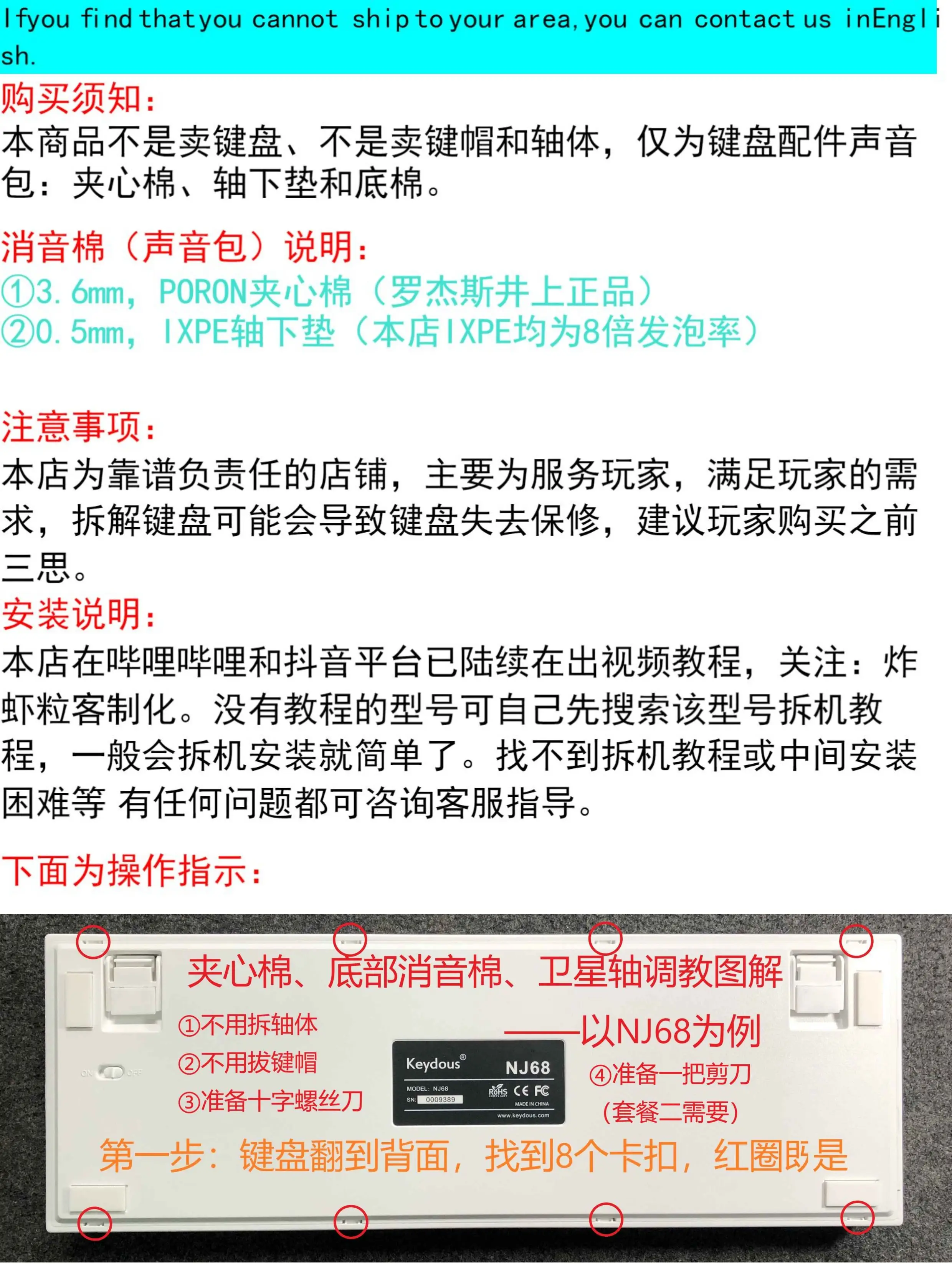 Aviso de compra:Este producto no vende teclados, teclas ni cuerpos de eje, solo accesorios de teclado como paquetes de sonido: algodón sándwich, almohadilla de eje, algodón inferior, placa de posicionamiento, etc.Las imágenes son solo de referencia, consulte el producto real para obtener más detalles.Instrucciones de algodón silenciador (paquete de sonido):1 3,5 mm, algodón sándwich Poron (Rogers Inoue genuino)2 Almohadilla de eje Ixpe de 0,5 mm (todas las Ixpe en nuestra tienda tienen una tasa de espuma de 8 veces)Este modelo utiliza una almohadilla debajo del eje para activar el modo de velocidad de la luz, lo que aumenta el retraso.Es normal no encender el modo de velocidad de la luz.Determine si debe utilizarlo según sus preferencias personales (Disparador/Sonido).3 El algodón de fondo Poron de doble capa (Roger Inoue genuino) no estará demasiado lleno para afectar la elasticidad suave, ni demasiado delgado para causar un ruido excesivo de la cavidad. Adaptarse a la carcasa incorporada. Si es necesario reemplazar la carcasa, envíe un enlace o comuníquese con el servicio de atención al cliente con imágenes para ver si es compatible.