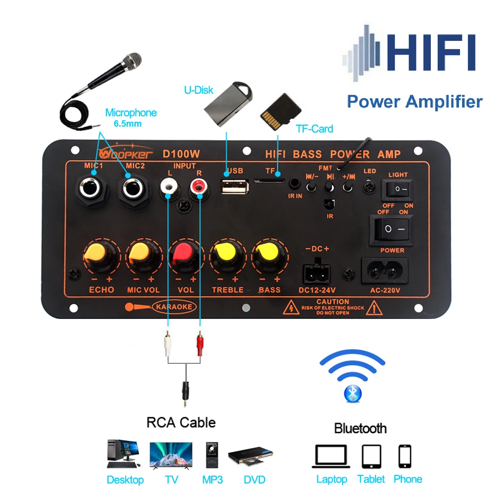 Comprar Woopker D1200 placa amplificadora de potencia 100W Bluetooth 5,0 amplificador de Audio Digital 2,0 canales Subwoofer soporte micrófono Dual MP3