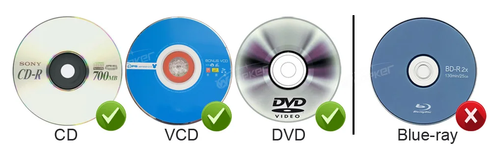 1. DVD, CD, VCD can be read, but not be recorded.