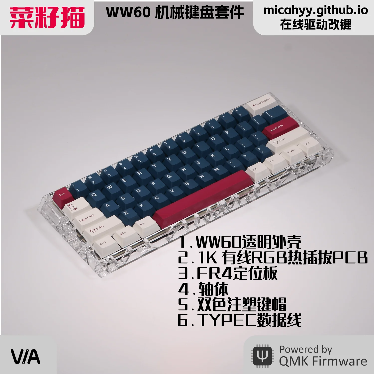 Wooting GH60 Mechanical Keyboard 61-Key 1K/8K Polling Rate HotSwap RGB Backlight QMK/VIA Key Remapping Wired Hands on set DIY