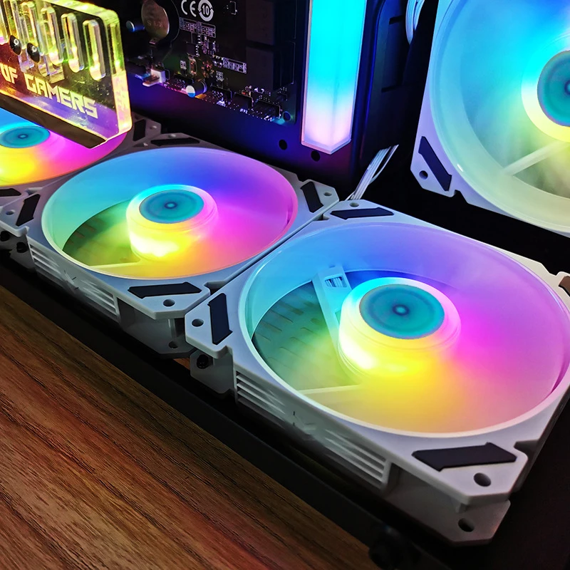 4. Admite placas base ARGB de 5V3 pines como ASUS, MSI, Gigabyte, ASRock, etc., a través del control de software de sincronización de iluminación de ventilador; admite 16 millones de colores programables.