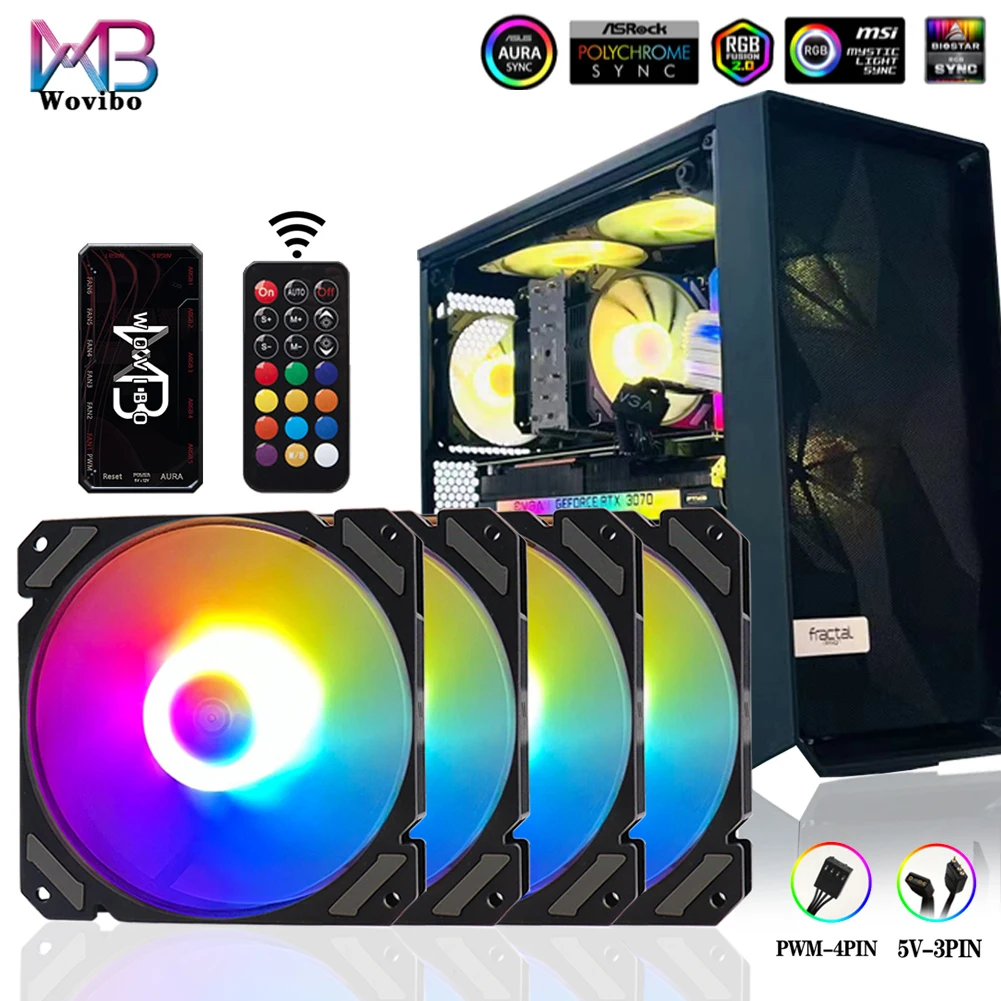 Comprar Wovibo-Ventilador enfriador de carcasa de PC, 12cm, 4 pines, PWM, 120mm, para chasis de ordenador, 5V, 3 pines, ARGB, Ventilador Aura Sync, radiador de refrigeración, disipador térmico