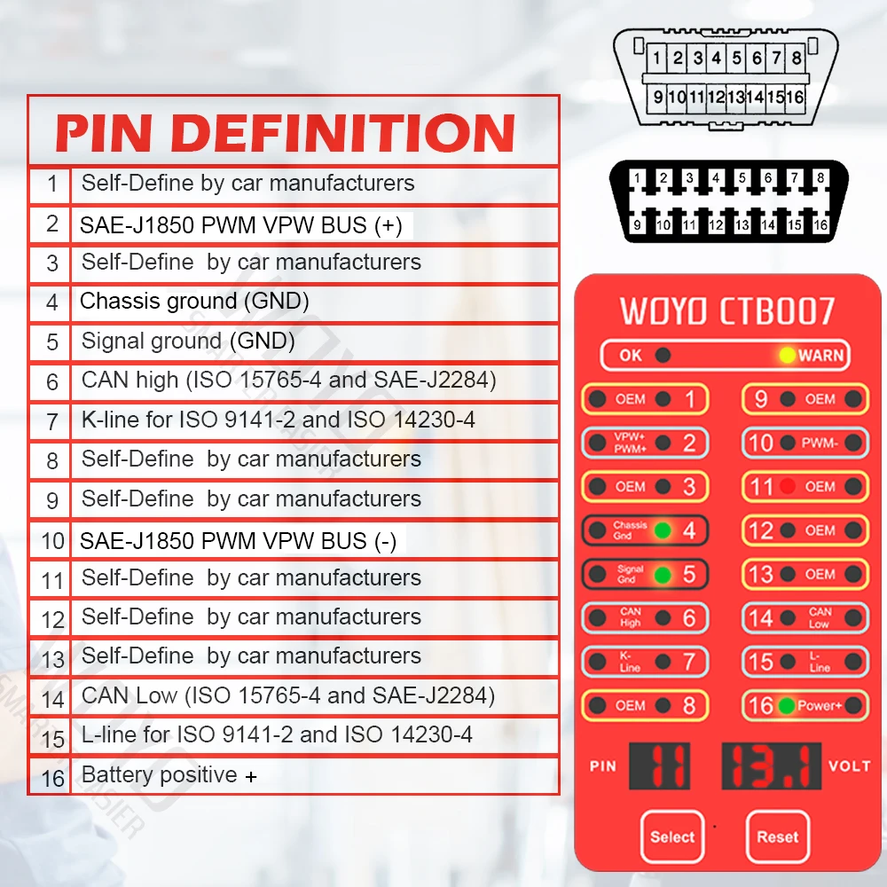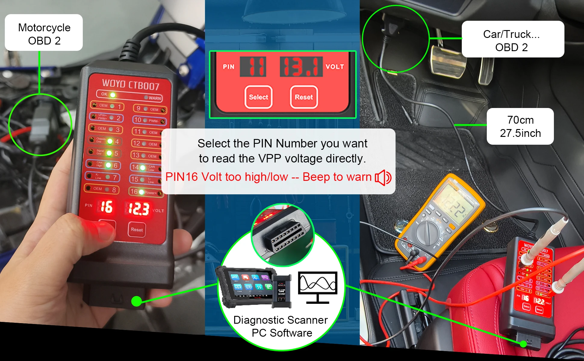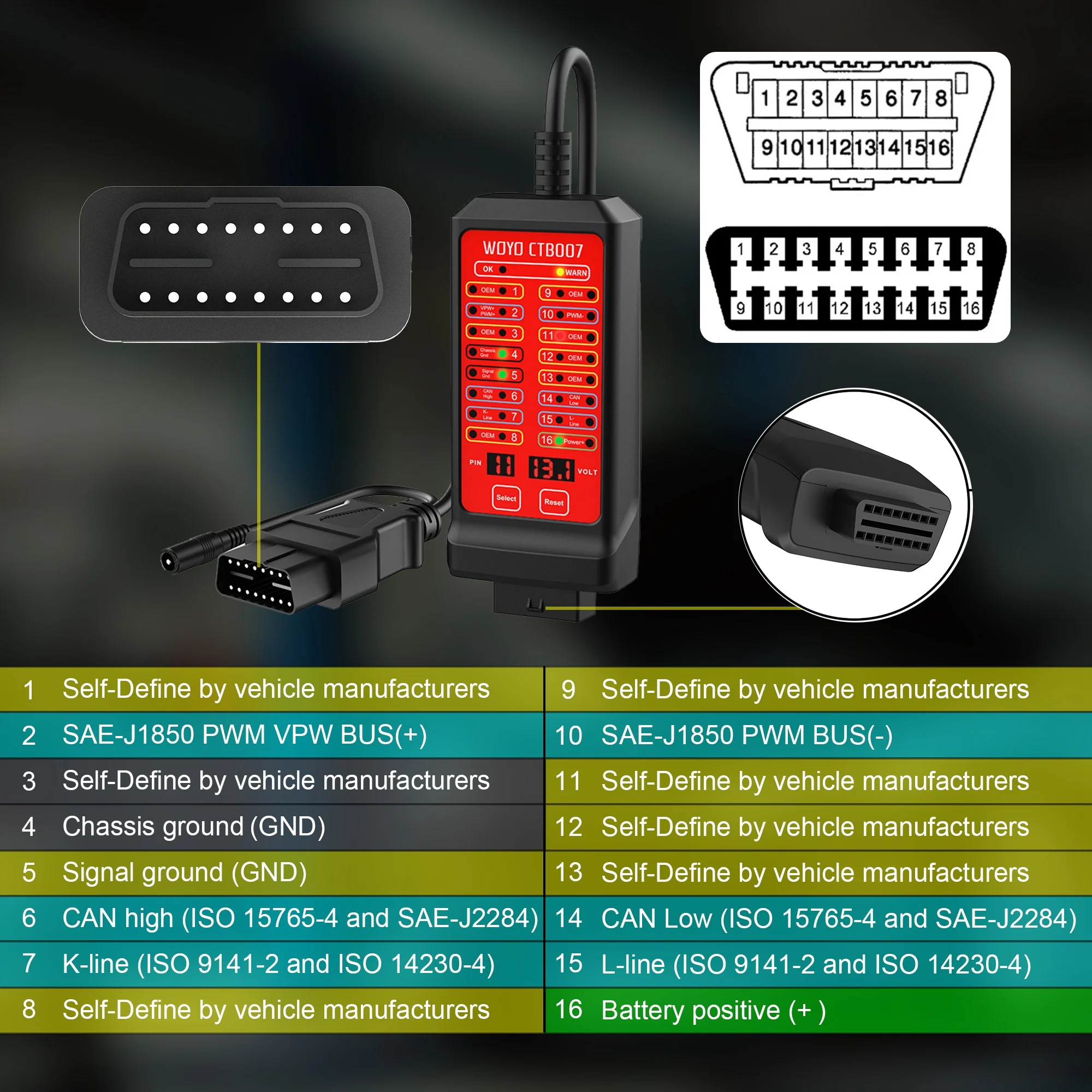 CTB007 también puede probar el voltaje de 16 pines OBD