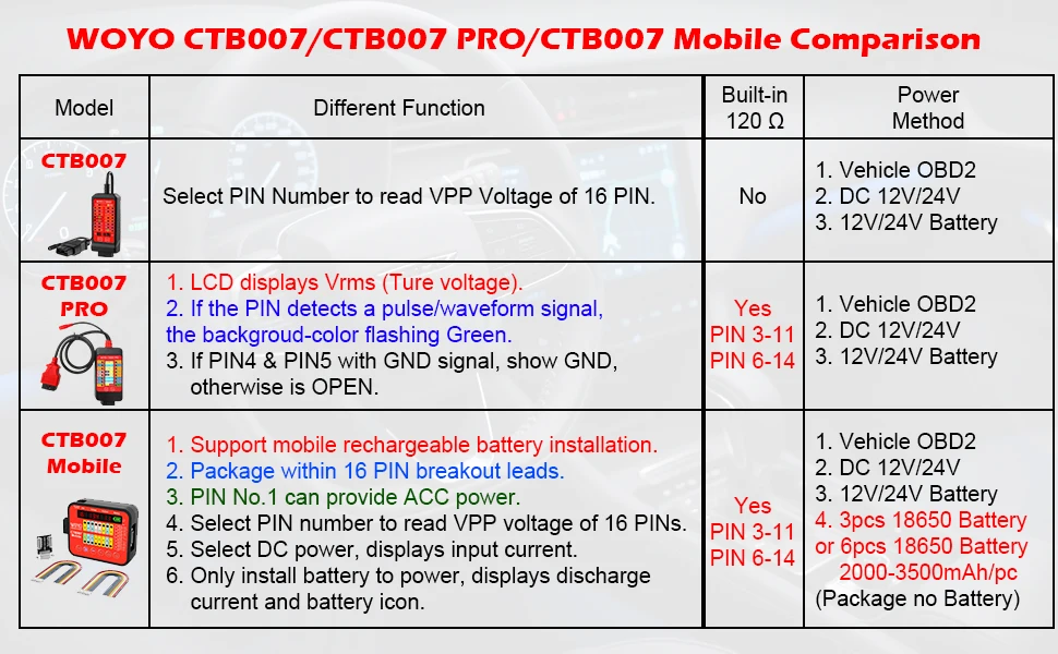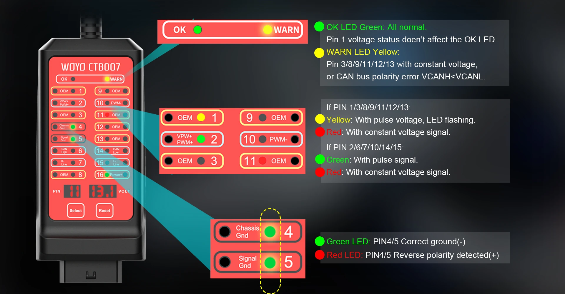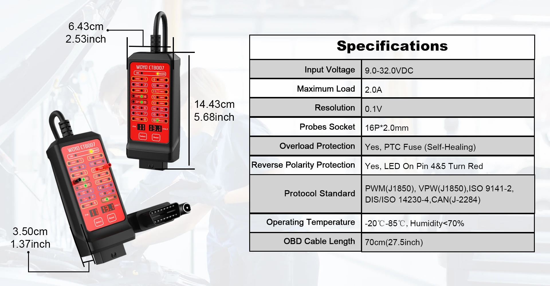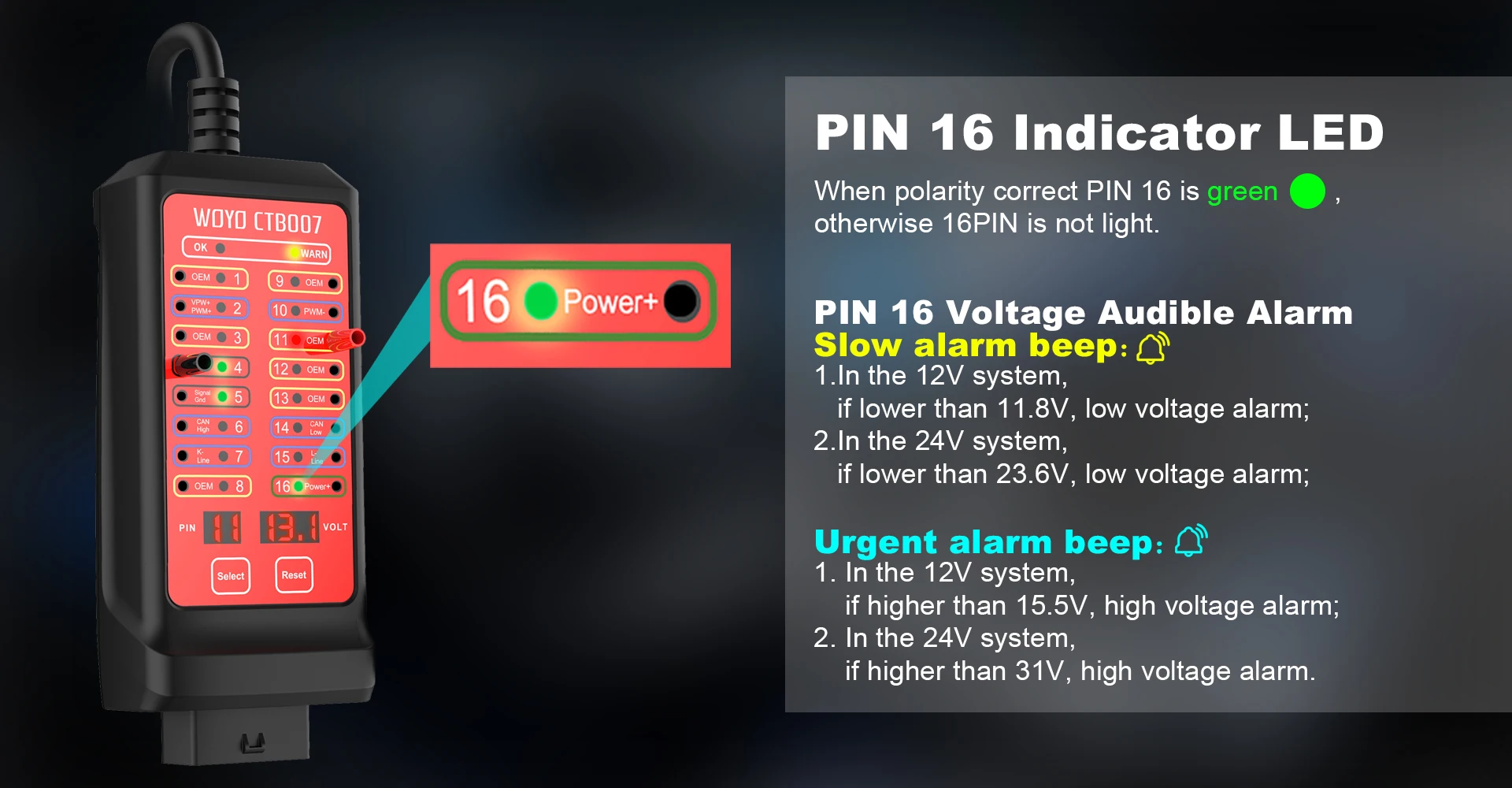 CTB007 también puede probar el voltaje de 16 pines OBD