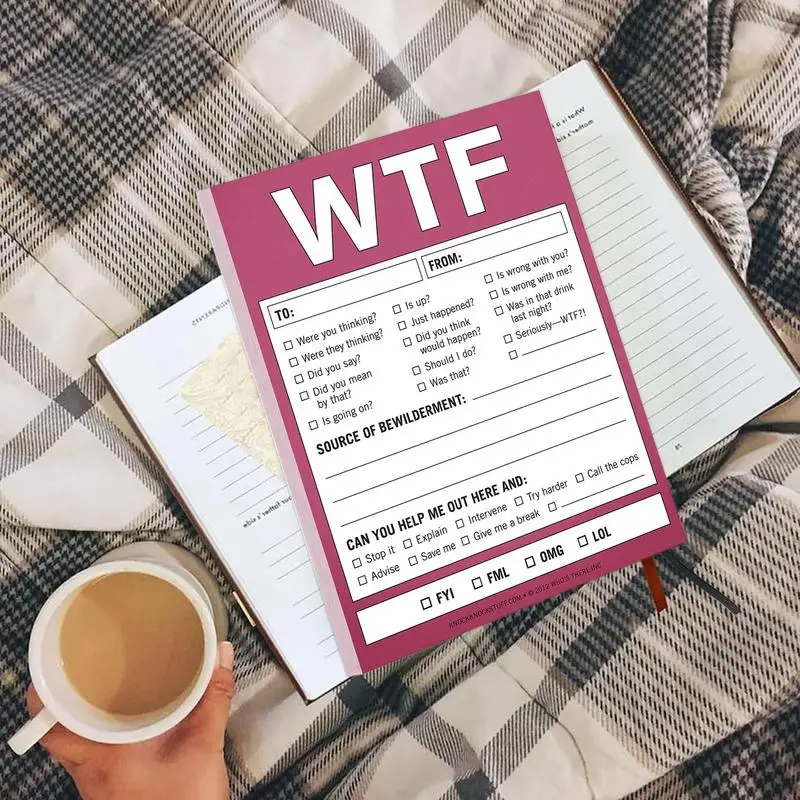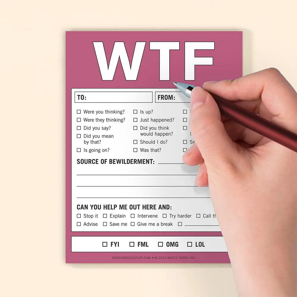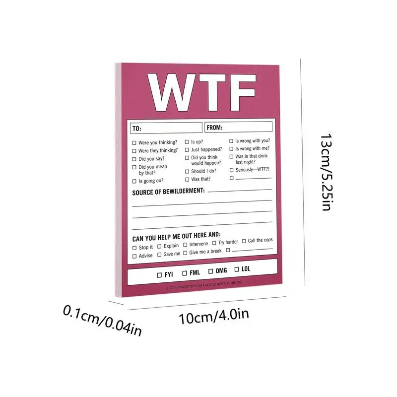 Este Bloc de notas WTF es perfecto para cualquier persona con sentido del humor que necesite expresar la confusión que siente en cualquier situación. Con suficiente espacio para expresar una gran cantidad de emociones, Esta almohadilla de alta calidad es resistente al desgarro y presenta Artesanía de impresión.