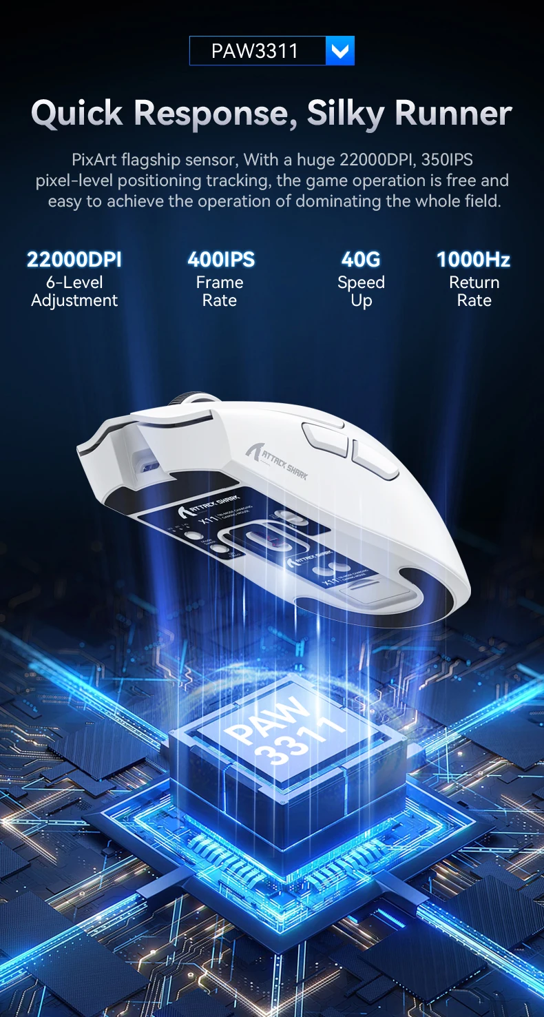 --1.Sensor PAW3311, 22000DPI, 400IPS, 1000Hz, tasa de 40G.