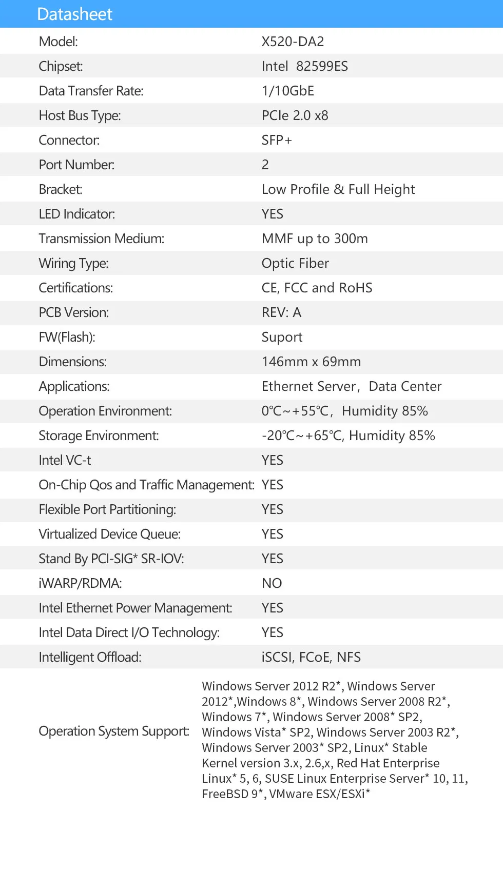 Impulsado por el controlador de red 10 GbE de tercera generación de Intel, Intel® Controlador Ethernet 82599 de 10 Gigabit Ethernet, el X520-DA2 aborda las necesidades exigentes del centro de datos de próxima generación al proporcionar funciones inigualables de virtualización, flexibilidad para redes LAN y SAN, y un rendimiento comprobado y confiable.