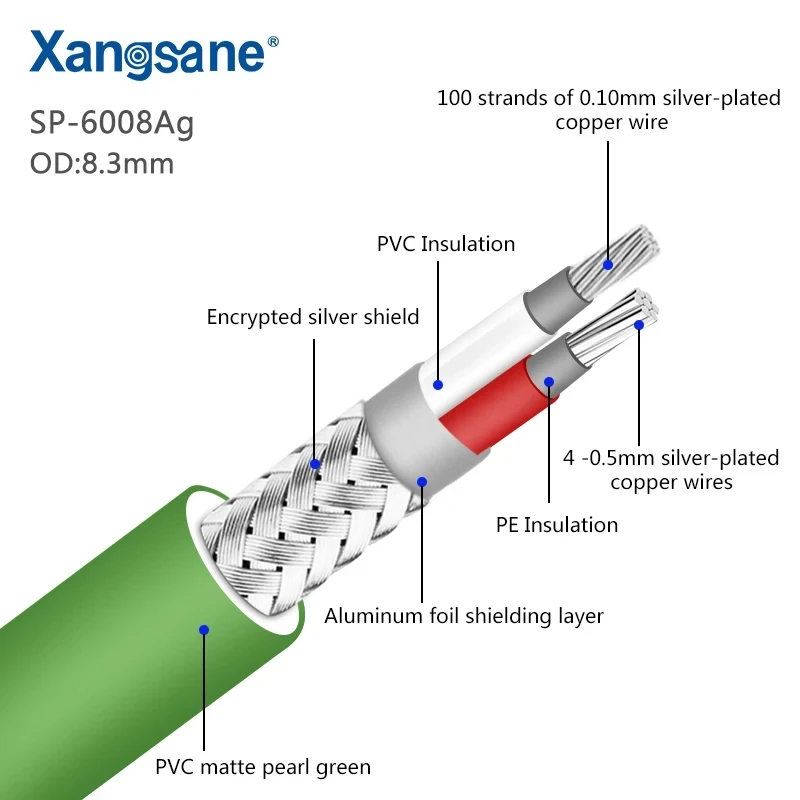 Se utilizan líneas de señal de audio chapadas en plata de cobre puro genuino de alta pureza. El conductor está hecho de cobre plateado + cobre fino plateado, su función principal restaura el campo de sonido de fidelidad de audio, por lo que la transmisión sin pérdidas de señales de audio tiene suficientes salvaguardias.También enriquece los detalles de la música, más claros y transparentes.