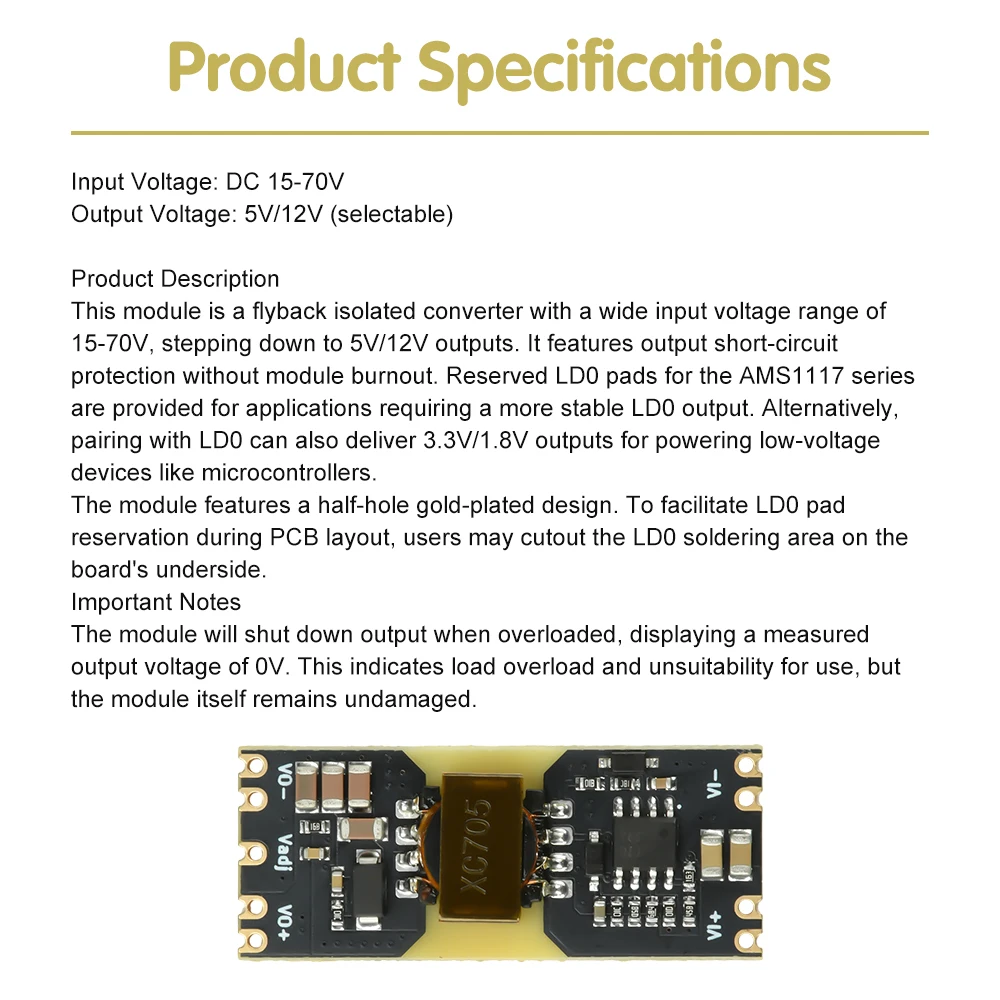 Este módulo es un convertidor aislado de flyback con un amplio rango de voltaje de entrada de 15-70 V, bajando a salidas de 5 V/12 V.Cuenta con protección contra cortocircuitos de salida para evitar que el módulo se queme.Los pads LDO reservados de la serie AMS1117 permiten la aplicación en escenarios que requieren salidas LDO más estables.Cuando se combina con un LDO, también puede generar 3,3 V/1,8 V para alimentar dispositivos de bajo voltaje como microcontroladores.