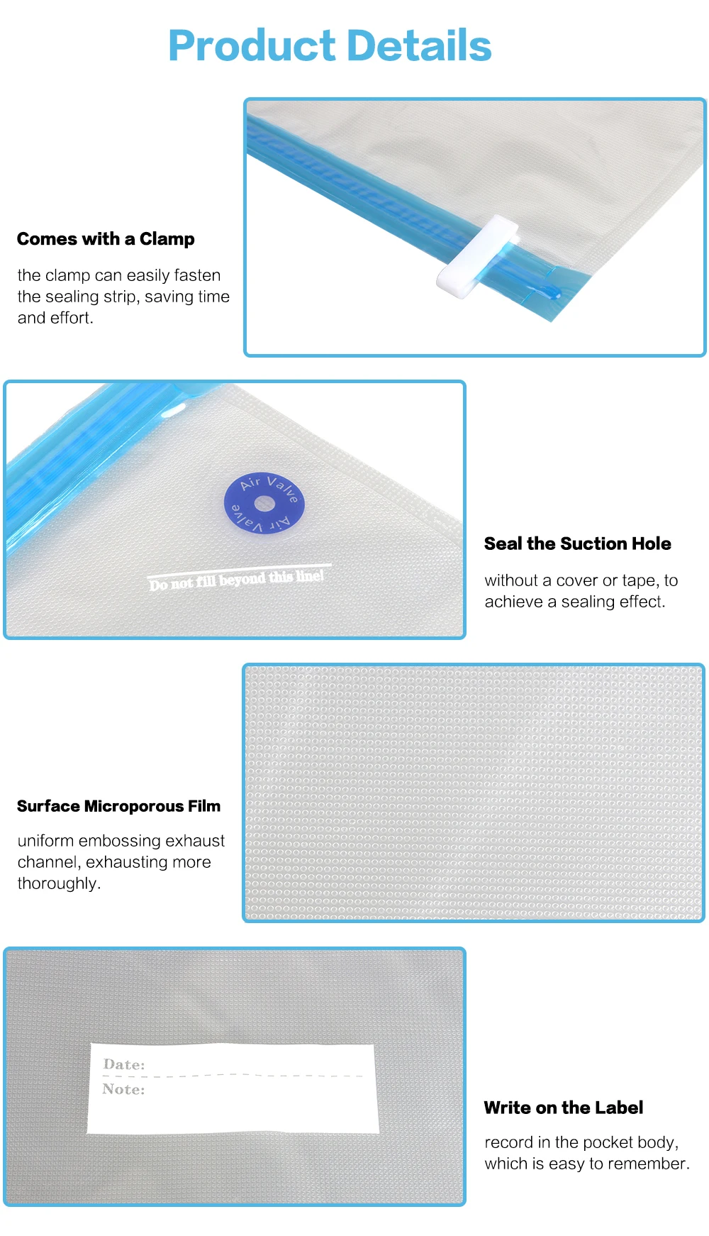 Kit C:20 piezasBolsa de almacenamiento al vacío transparente +1 unidadSellador Bomba de Aire Extractor +2 piezasAbrazadera +40 piezasDirer