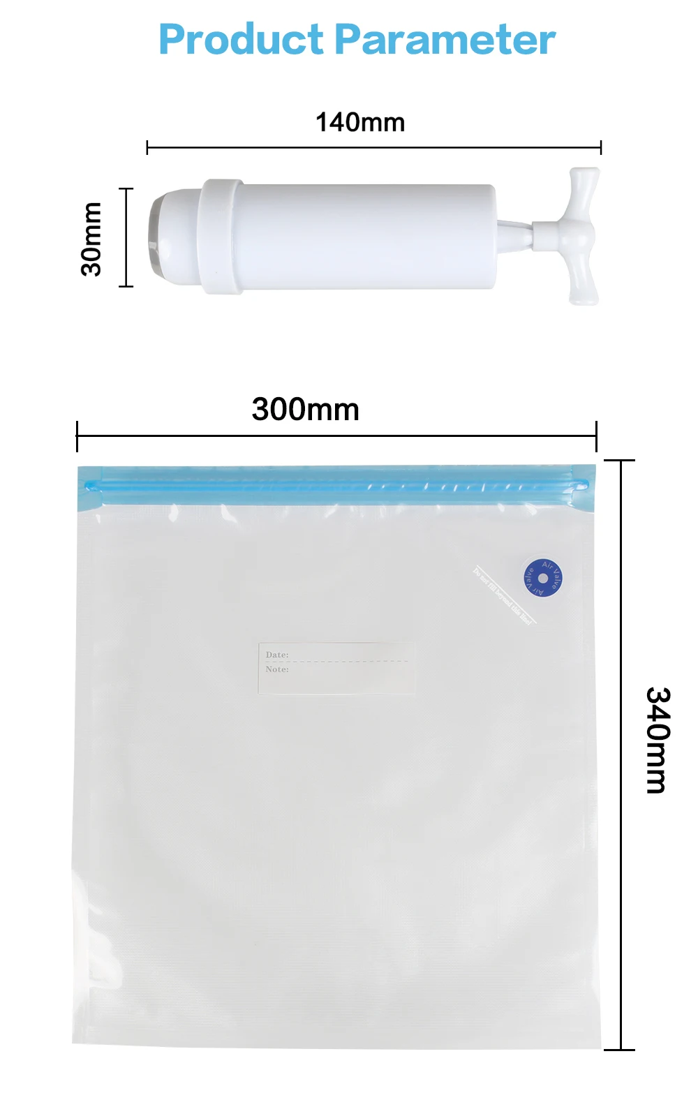 Kit B:10 piezasBolsa de almacenamiento al vacío transparente +1 unidadSellador Bomba de Aire Extractor +2 piezasAbrazadera +20 piezasDirer