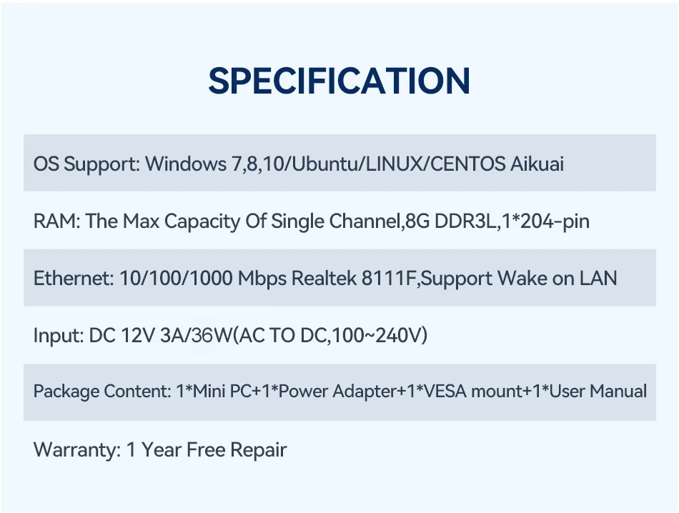 Ram 2G, 4G, 8G opcional; J6412: DDR4 SODIMM x1, admite hasta 16 GB