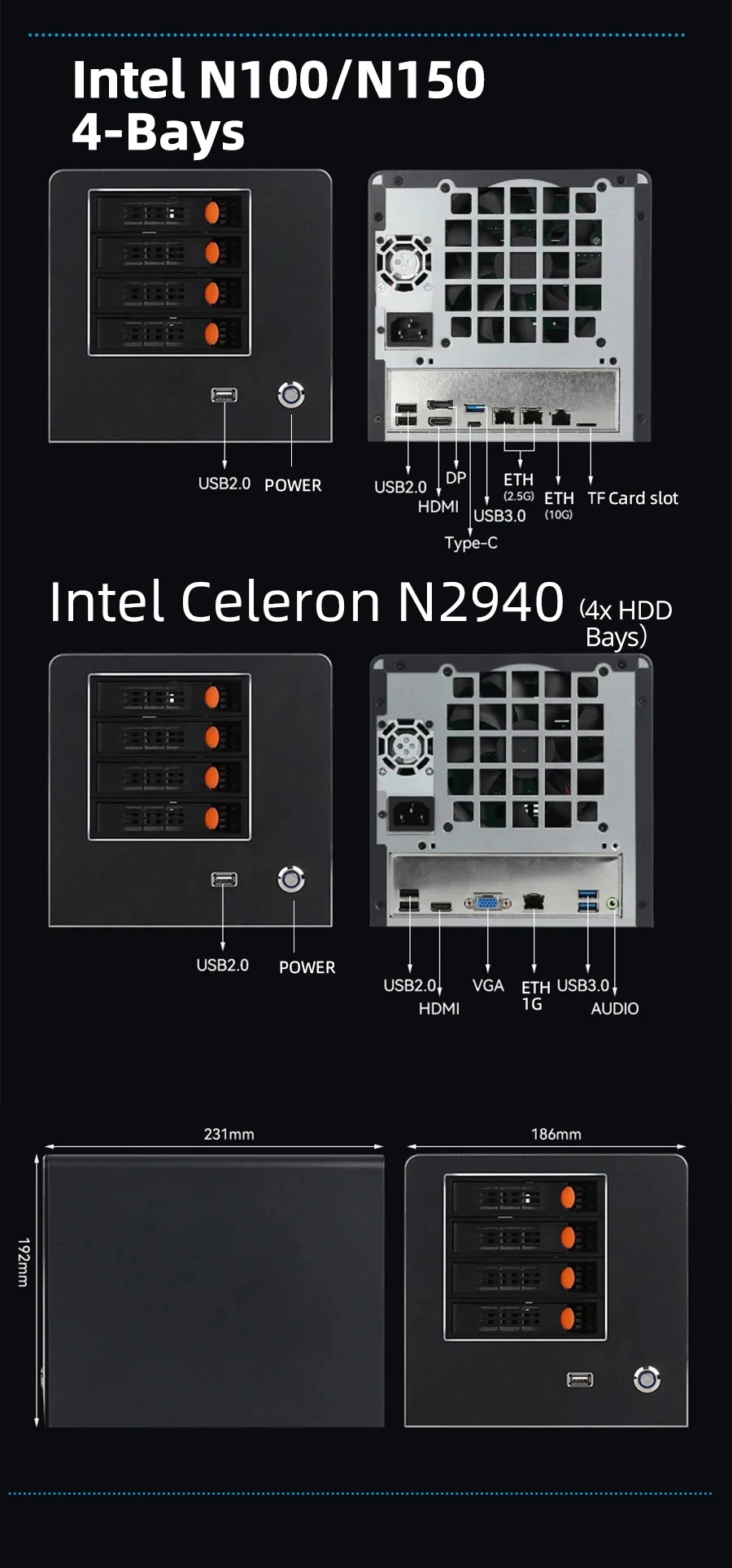 4 bahías admite HDD de 2,5 o 3,5 pulgadas, cada bahía admite un disco duro máximo de 18 TB