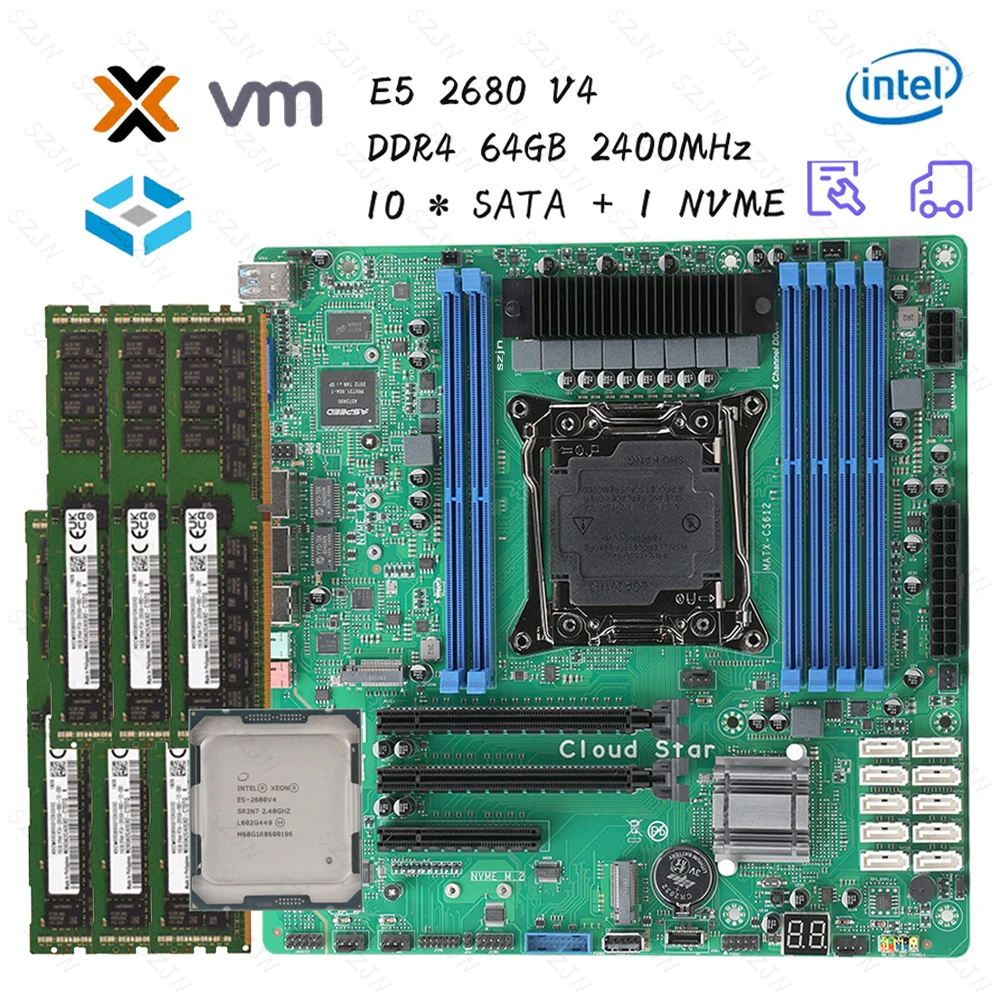 Comprar XEON-Kit de placa base Nas 10 SATA con E5 2680V4 DDR4, 64GB, compatible con Turbo PCIE Split para enrutador NAS Sever 2x2,5 GbE I226, 24x24cm