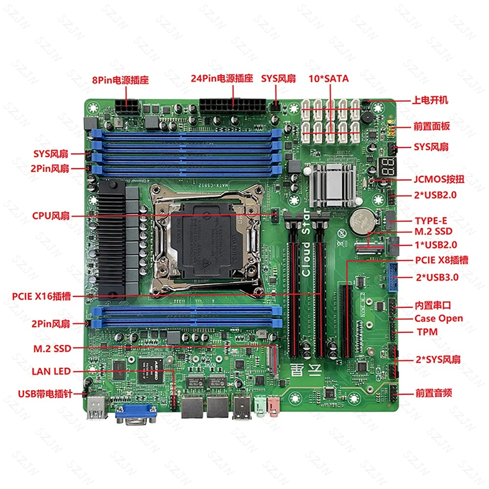 Las características principales de la placa base de la tarjeta madre del dispositivo son las siguientes: Admite CPU LGA2011 XEON. Soporta un ECC DDR4 de 2133 MHZ de cuatro canales, y memoria ERCC de 2400MHz con un máximo de 192GB y una sola ranura con un máximo de 32 GB. La pantalla admite VGA admite dos redes de 2,5 Gbps; admite dos interfaces M.2 (Solo NVME) soporta nueve puertos USB y un puerto de 2 a 3,0. Admite dos ranuras PCIE X16 y una ranura PCIE X8. Admite 10 puertos SATA. Incorpora un puerto serie RS232. Soporta un trabajo de temperatura amplio de 10 ~ 60 grados.; Botón CMOS claro incorporado, solución de problemas y resolución de problemas más rápido;
