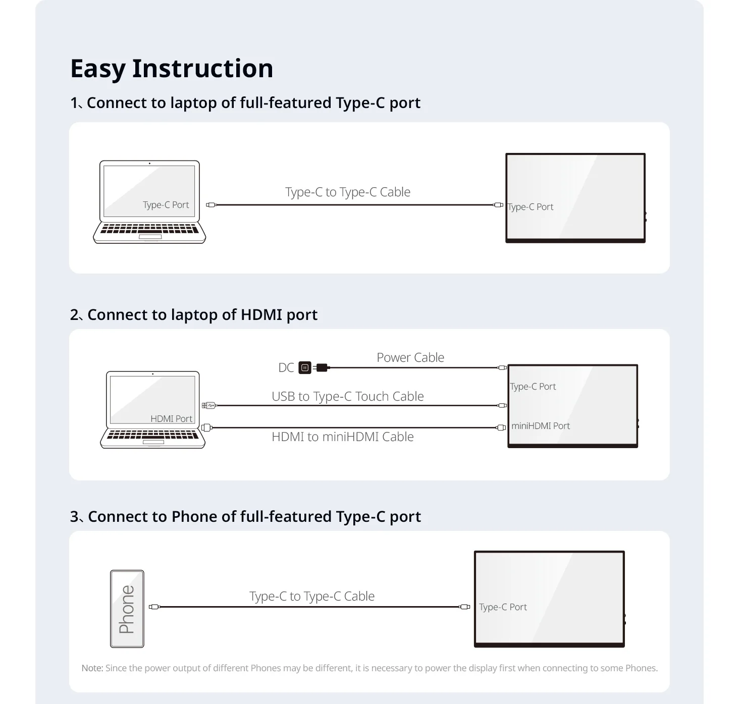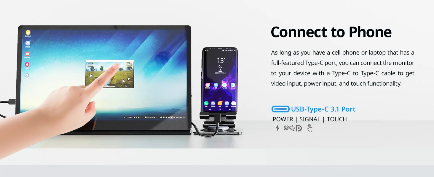 3. Si necesita la función táctil, conecte el cable USB A a C entre su ordenador portátil y monitor, y escriba el cable de soporte de función táctil directamente para el teléfono.