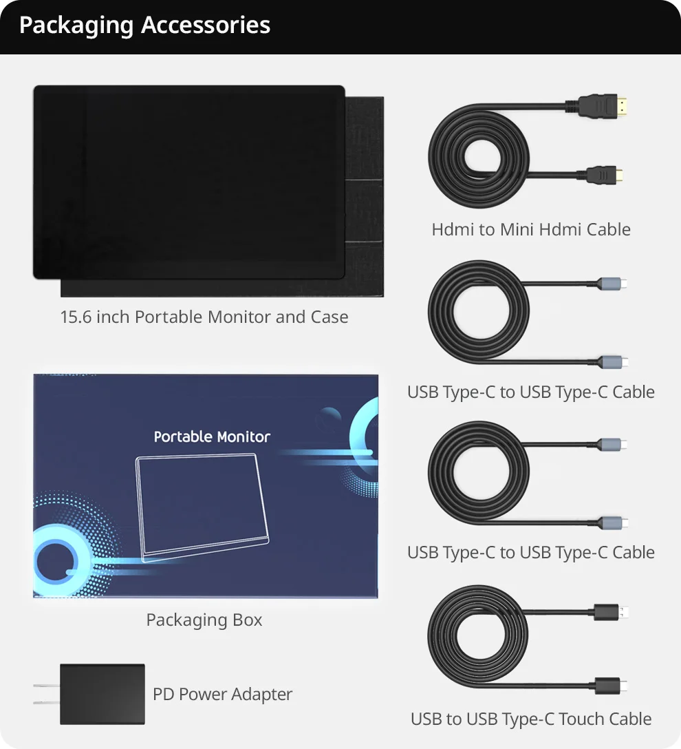Monitor portátil/Cable de 2 a 1/Cable USB A -C/Cable Mini HDMI/Adaptador de corriente/Manual de usuario/Cubierta protectora
