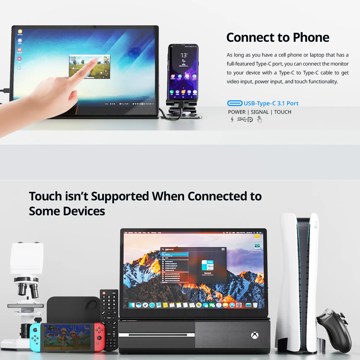 3. Si necesita la función táctil, conecte el cable USB A a C entre su ordenador portátil y monitor, y escriba el cable de soporte de función táctil directamente para el teléfono.