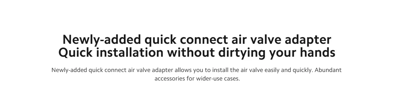 El adaptador de válvula de aire de conexión rápida recién agregado le permite instalar la válvula de aire fácil y rápidamente. Abundantes accesorios para casos de uso más amplio.