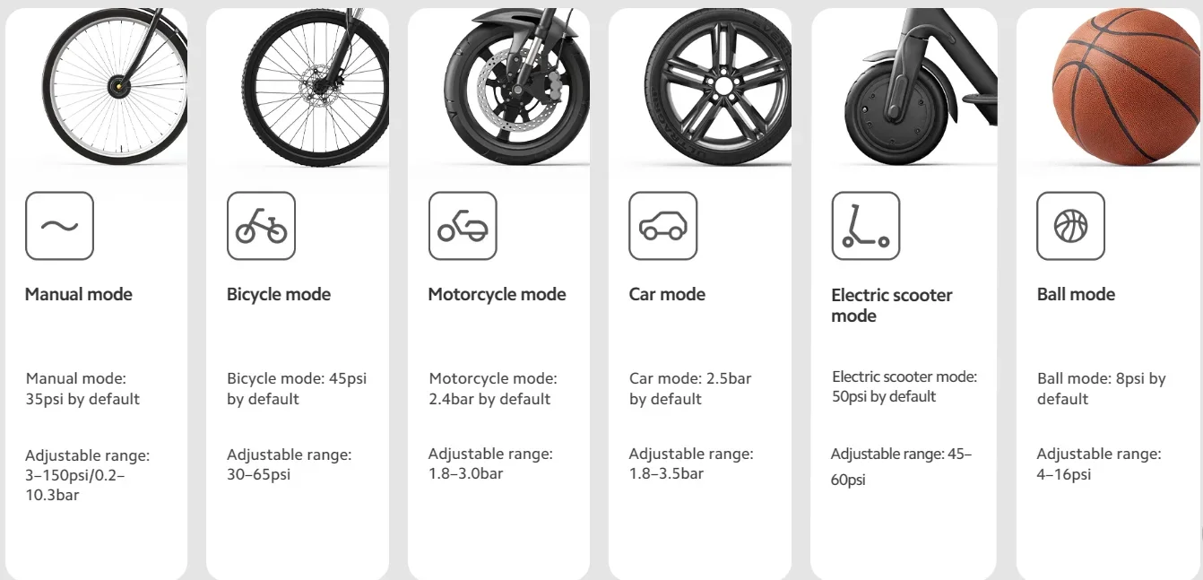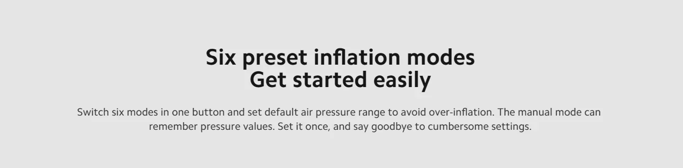 Cambie seis modos en un botón y configure el rango de presión de aire predeterminado para evitar el inflado excesivo. El modo manual puede recordar los valores de presión. Configúrelo una vez y Diga adiós a configuraciones engorrosas.